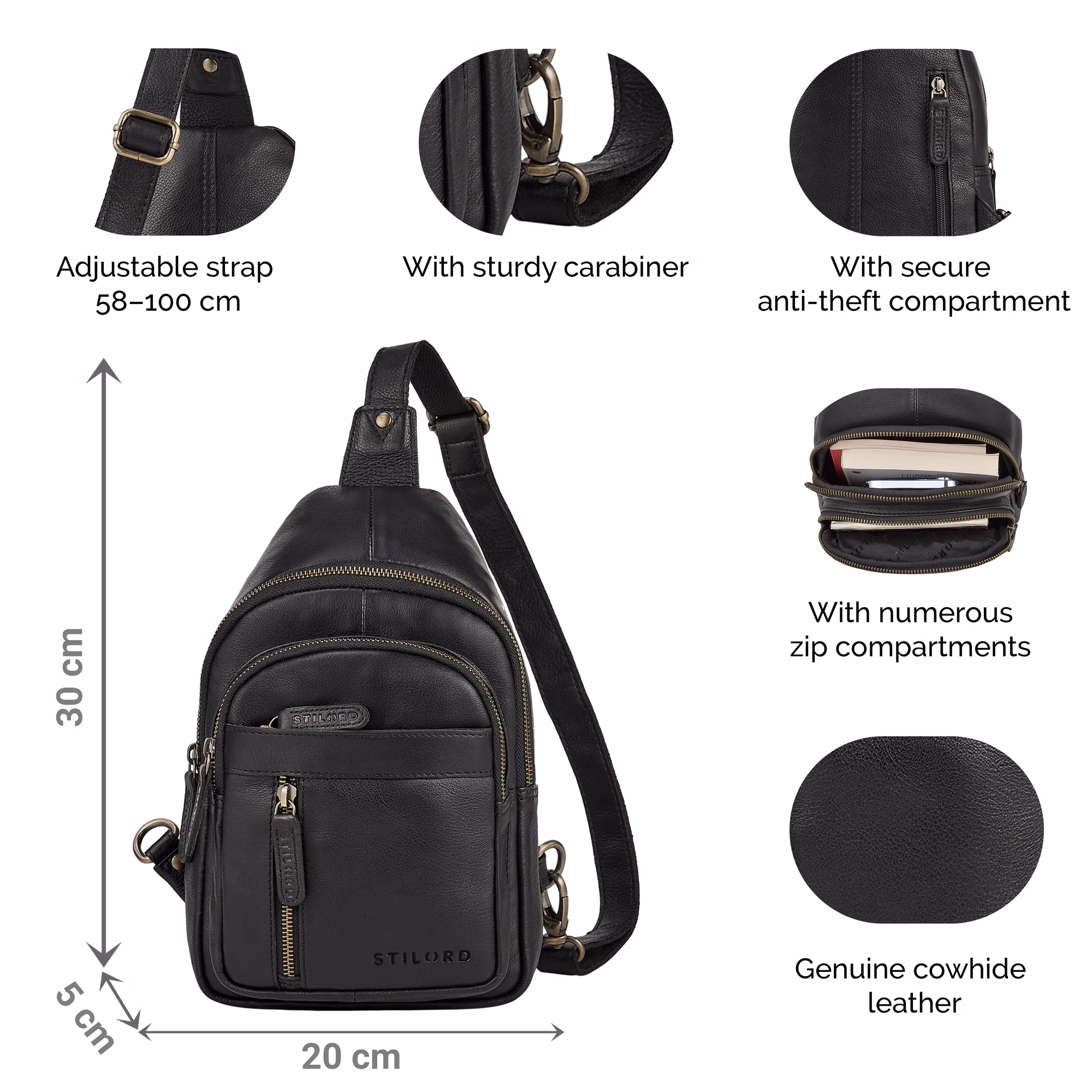 - DETALLES: Dimensiones (L x An x Al): 20 x 5 x 30 cm | Peso: 490 g | Modelo: "Montego" | Material: piel de vacuno auténtica | Marca: STILORD