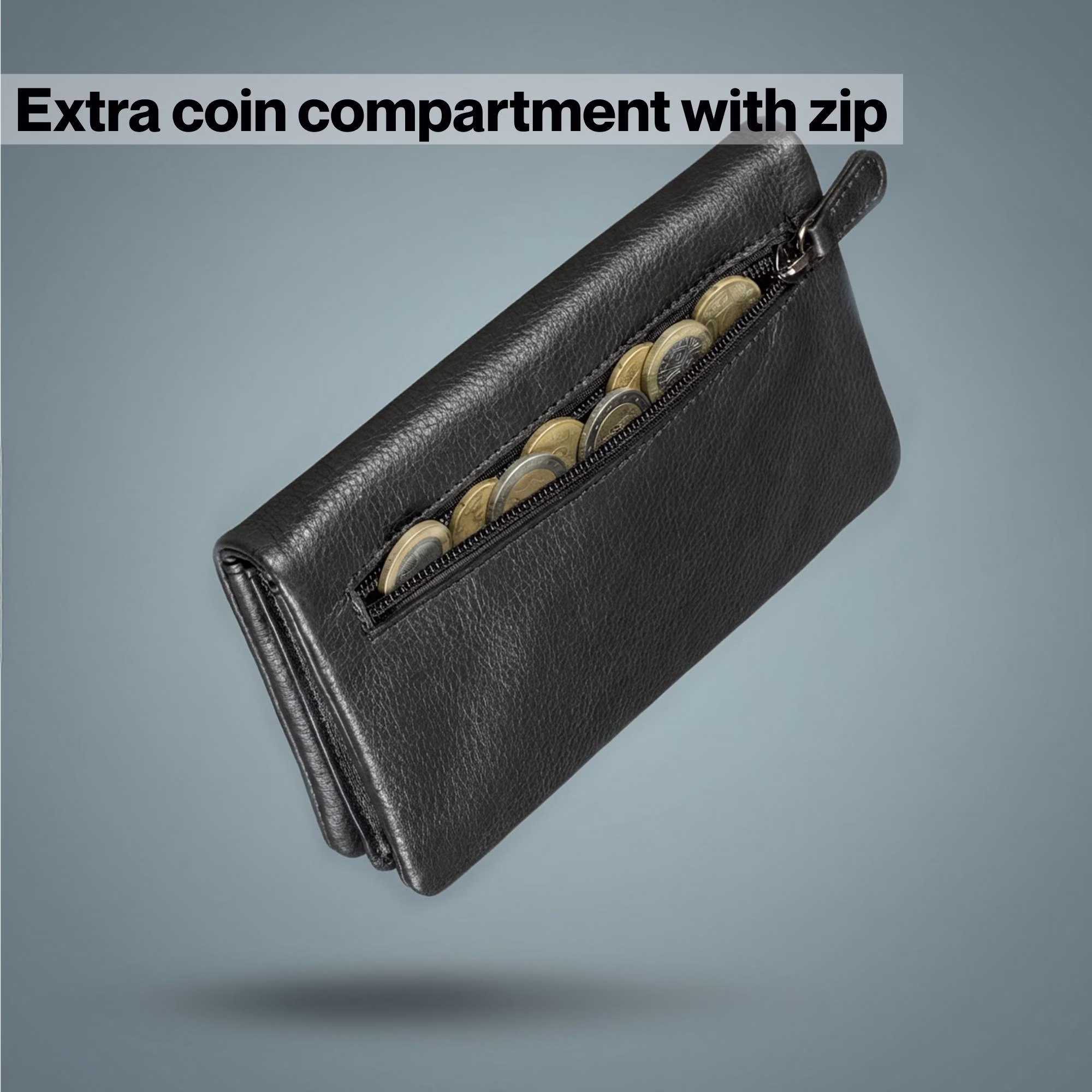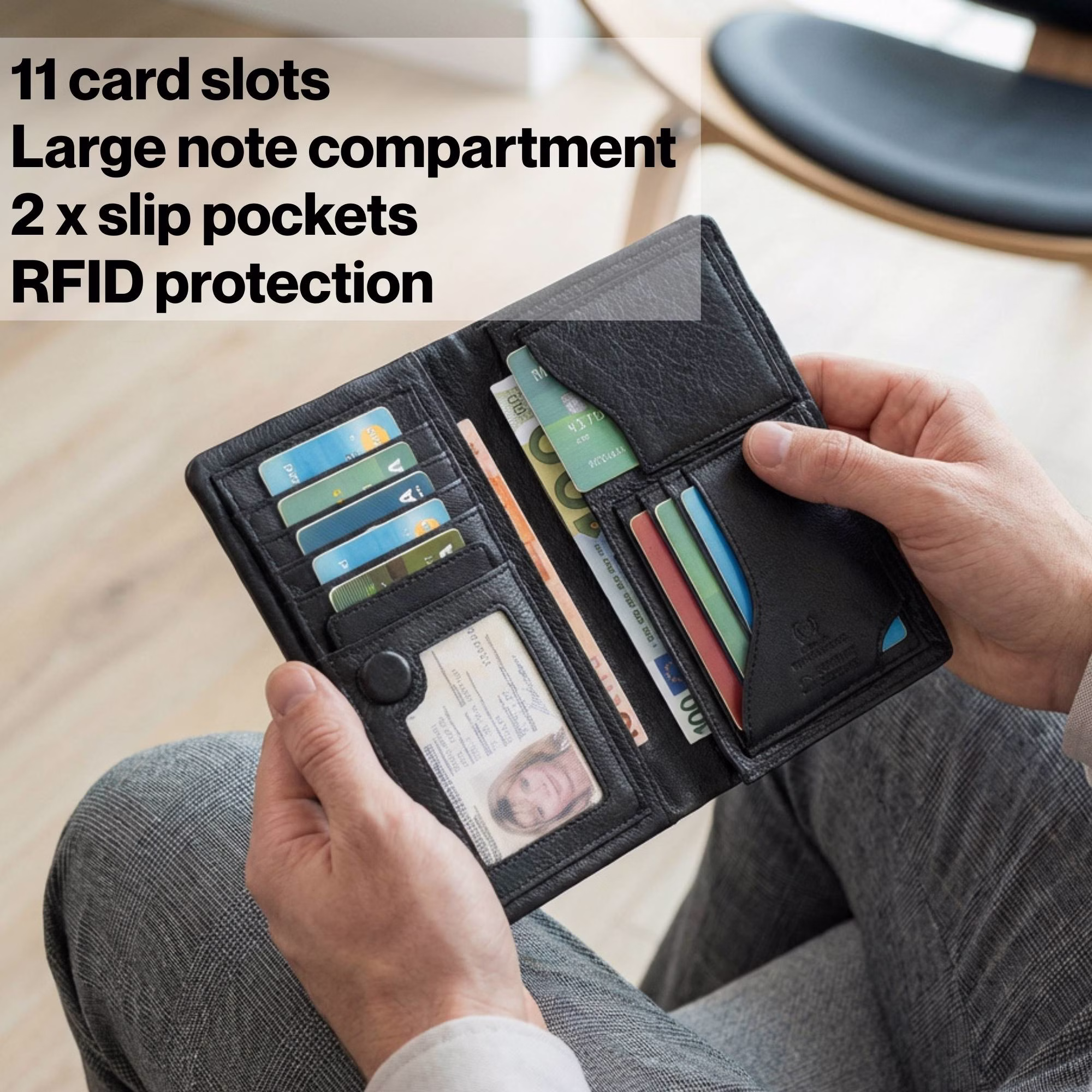 - Muchos compartimentos: 11 ranuras para tarjetas con ventana ID | 2 bolsillos interiores | 1 compartimento grande para billetes o smartphone | 1 billetero monedero hombre piel con cremallera en la parte trasera