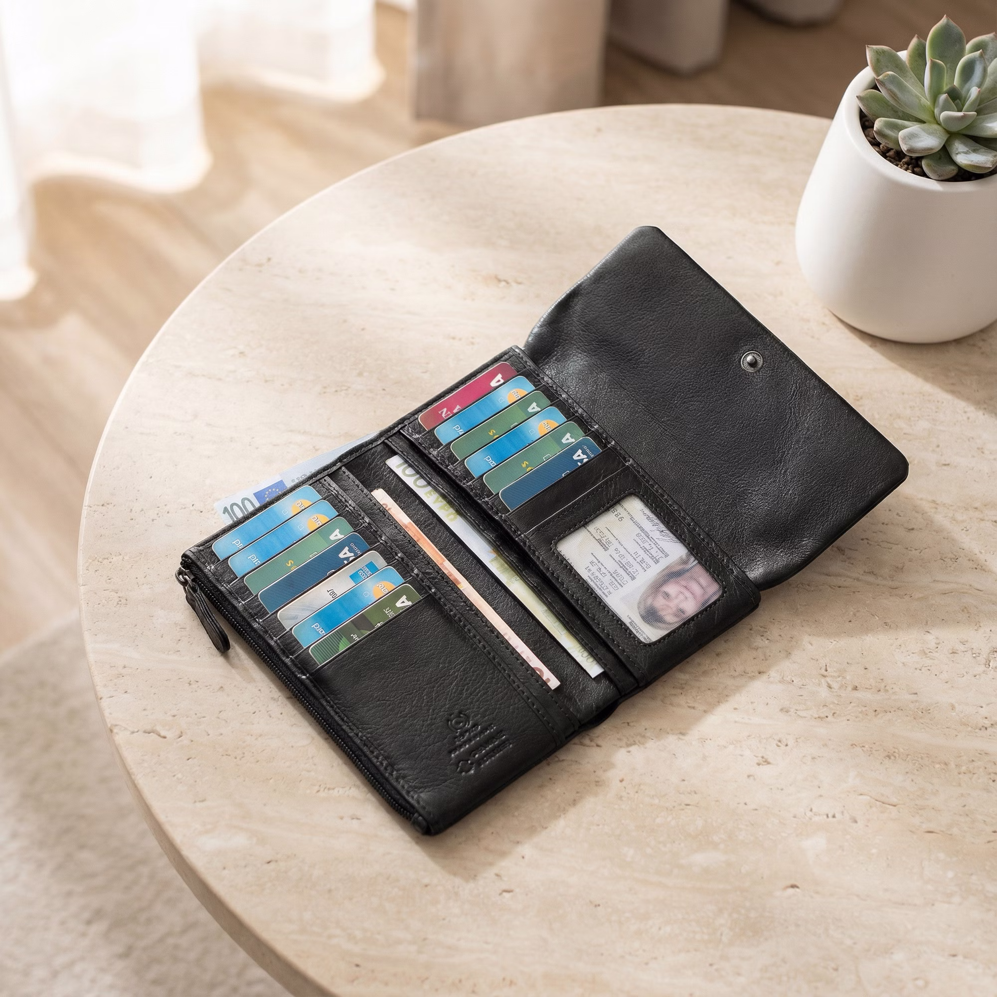Para mujeres que valoran la elegancia y el orden: esta cartera de mujer de cuero plegable ofrece amplio espacio para tarjetas, billetes y recibos. Con 14 ranuras para tarjetas incluido un compartimento de malla, cuatro bolsillos interiores y un compartimento para billetes, todo permanece organizado y siempre accesible. Se abre por completo y se cierra de forma segura con un botón a presión de alta calidad – ideal como Cartera mujer grande piel para quienes buscan estructura y un diseño atemporal.