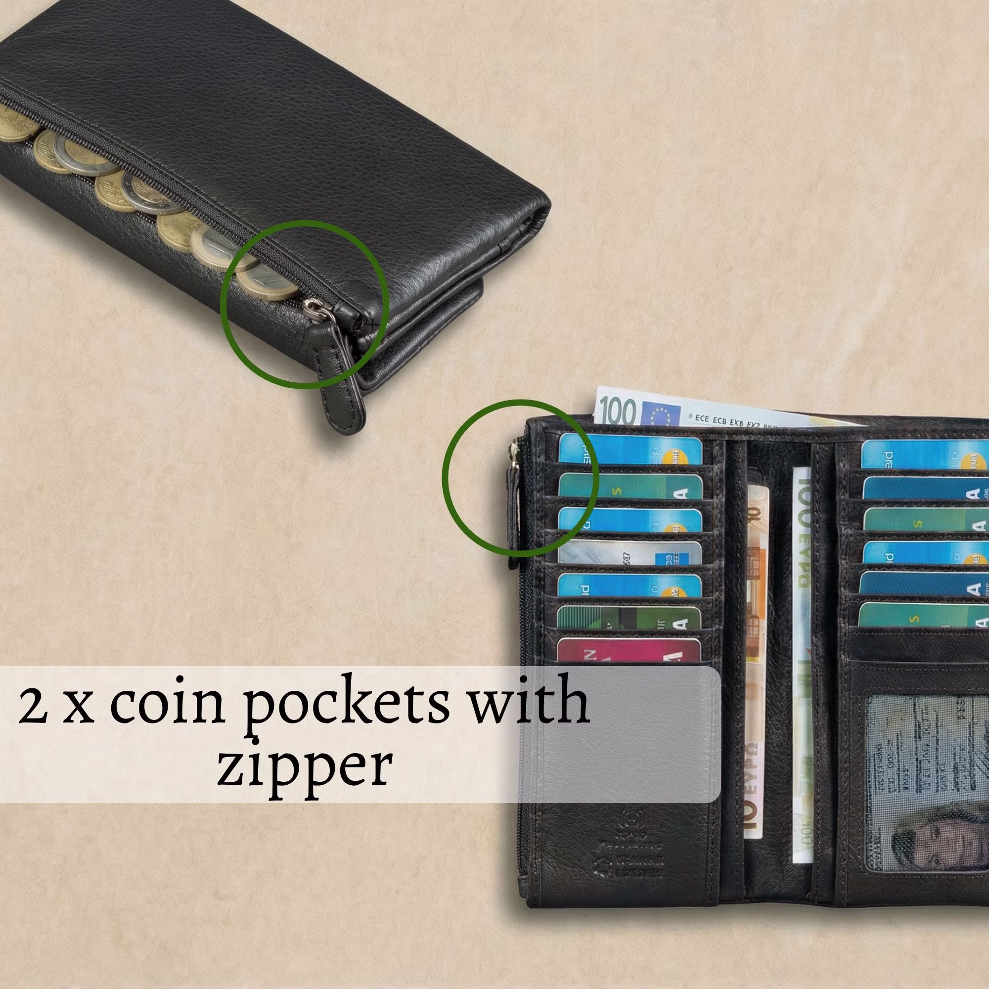 - XL CARTERA MUJER PIEL: Esta Cartera mujer grande piel con gran monedero ofrece 14 ranuras para tarjetas, 4 bolsillos planos, 1 compartimento para billetes y 2 amplio monedero con cremallera y protección RFID – una auténtica billetera grande de cuero diseñada para acompañarte todos los días con estilo.