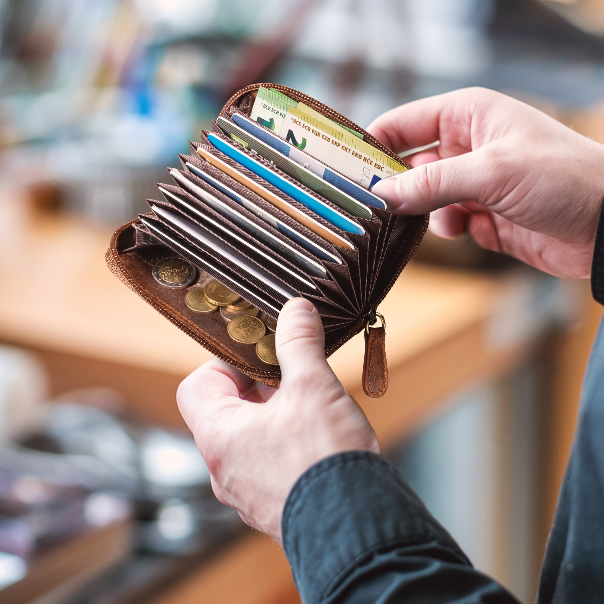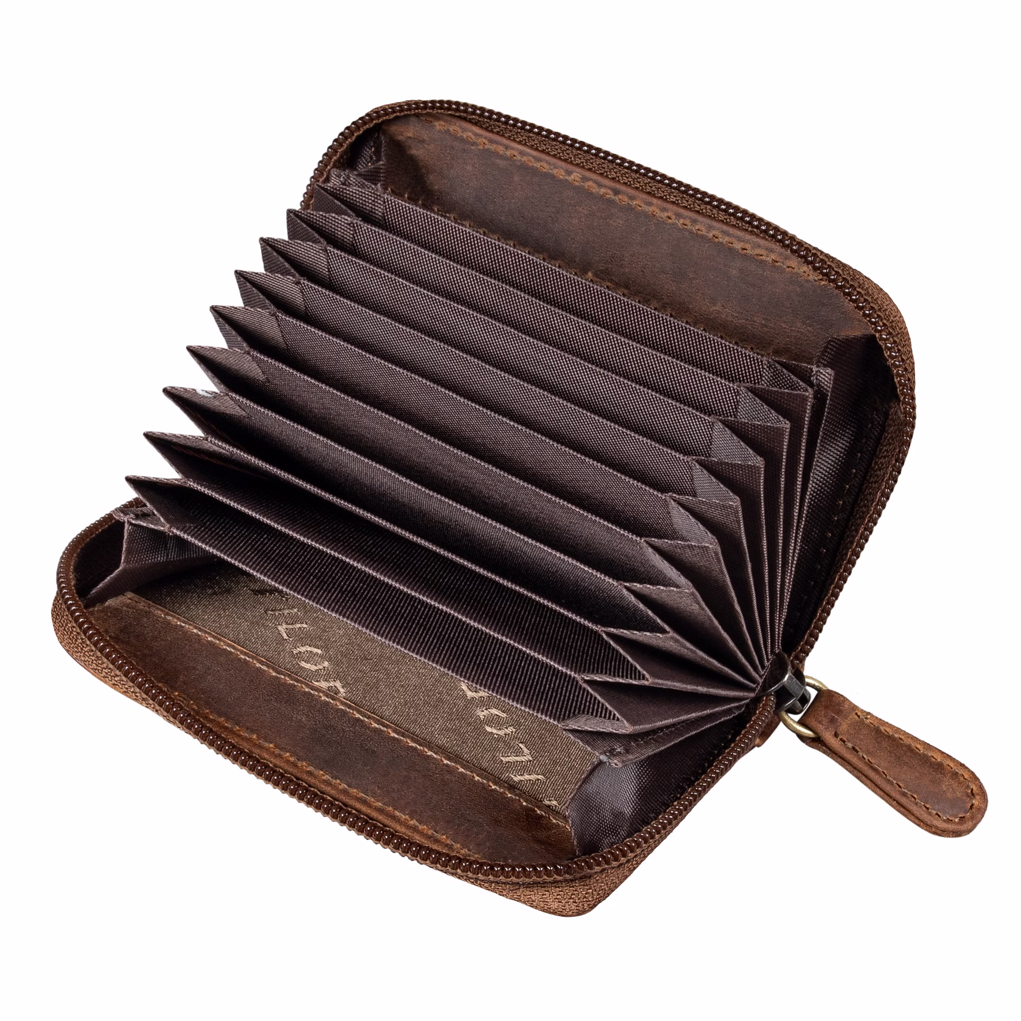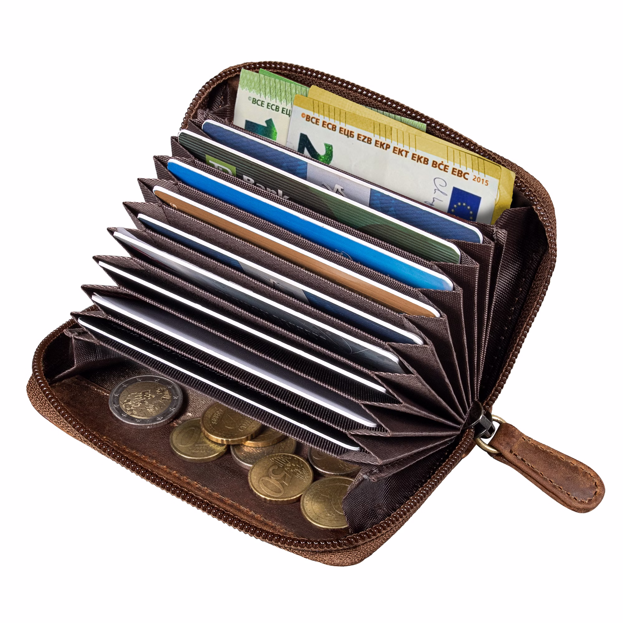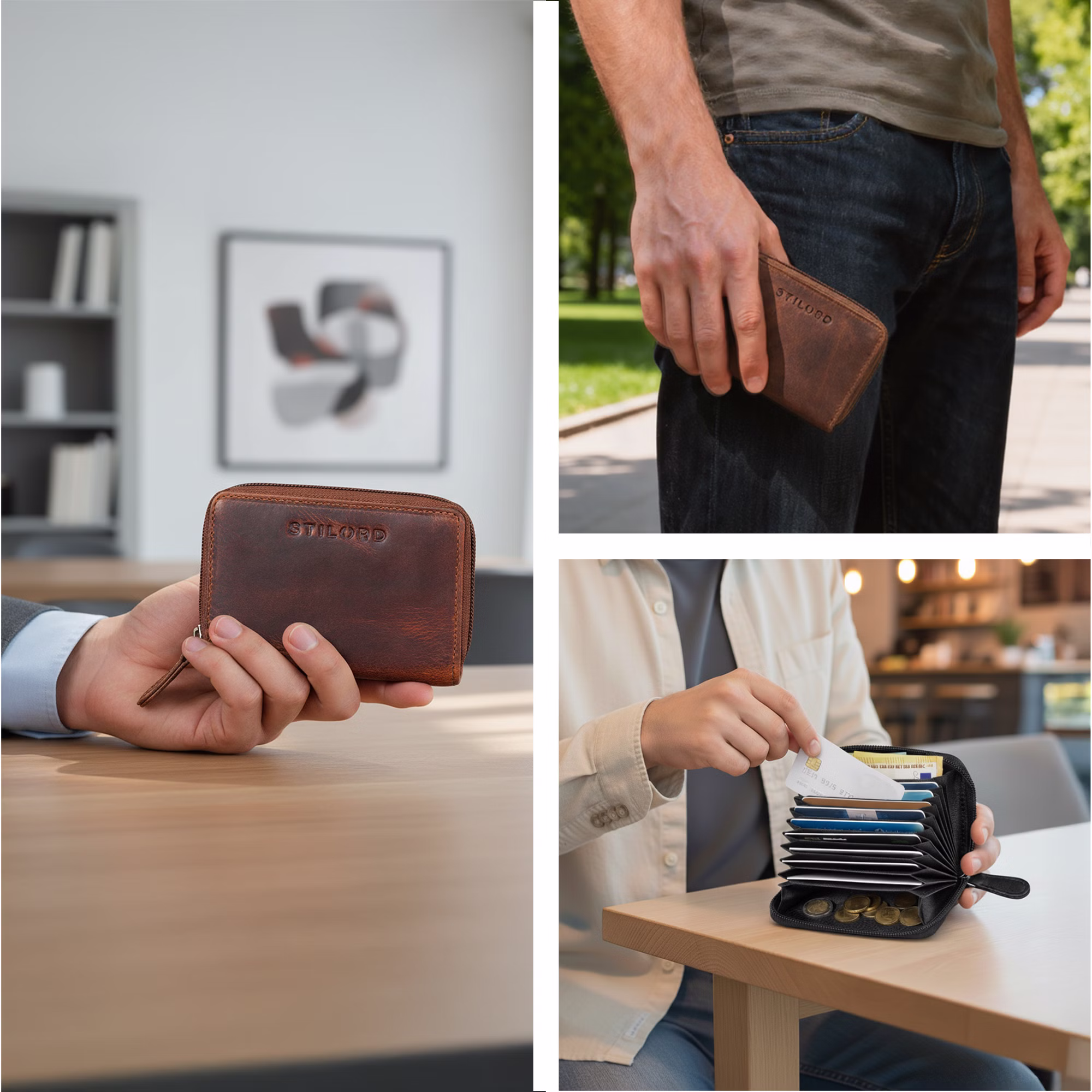 - Alta Capacidad: Anordnung: 1 x bolsillo para monedas con cremallera de acceso rápido | 1 x compartimento principal con cremallera segura | Interior: 11 ranuras para tarjetas | Espacio para billetes doblados.