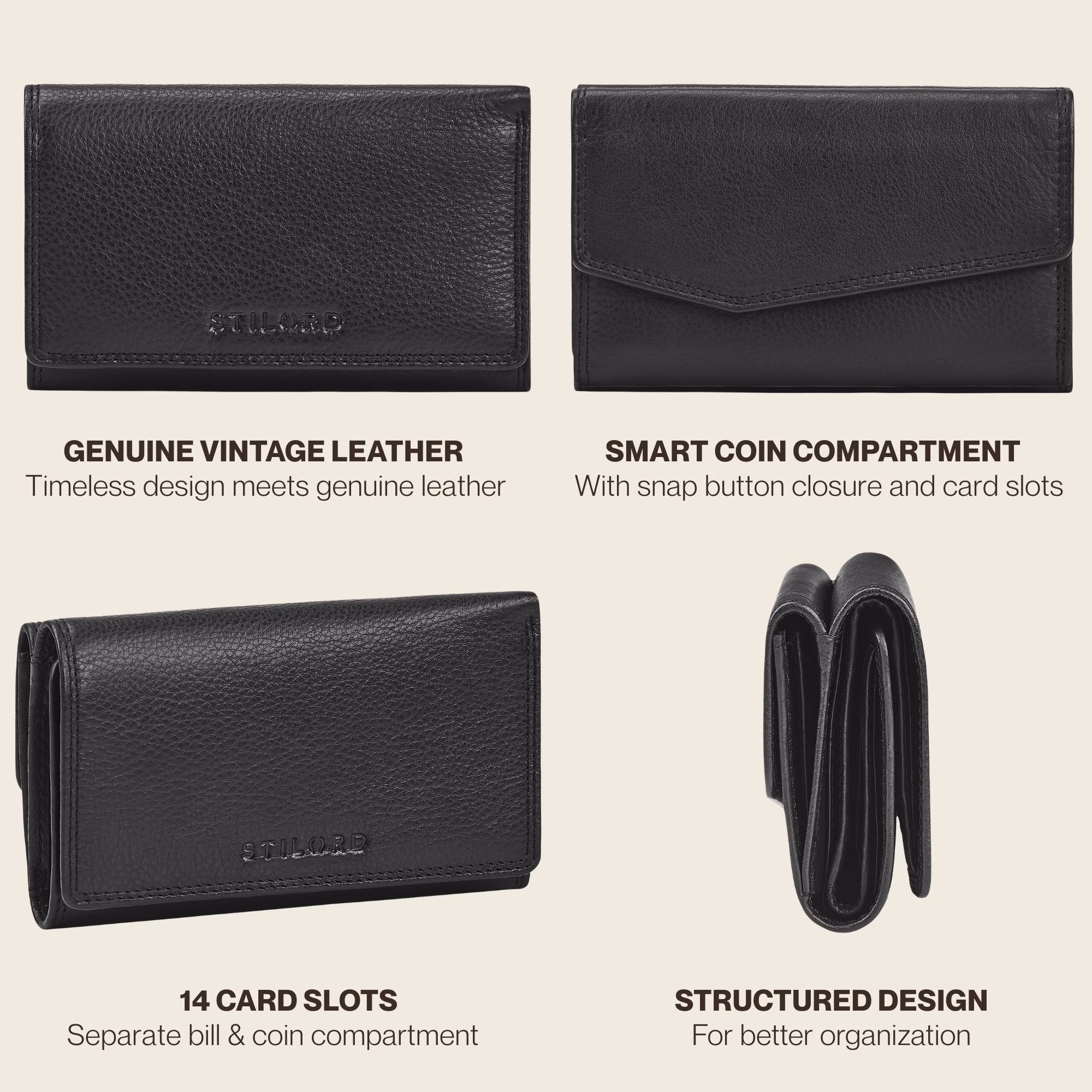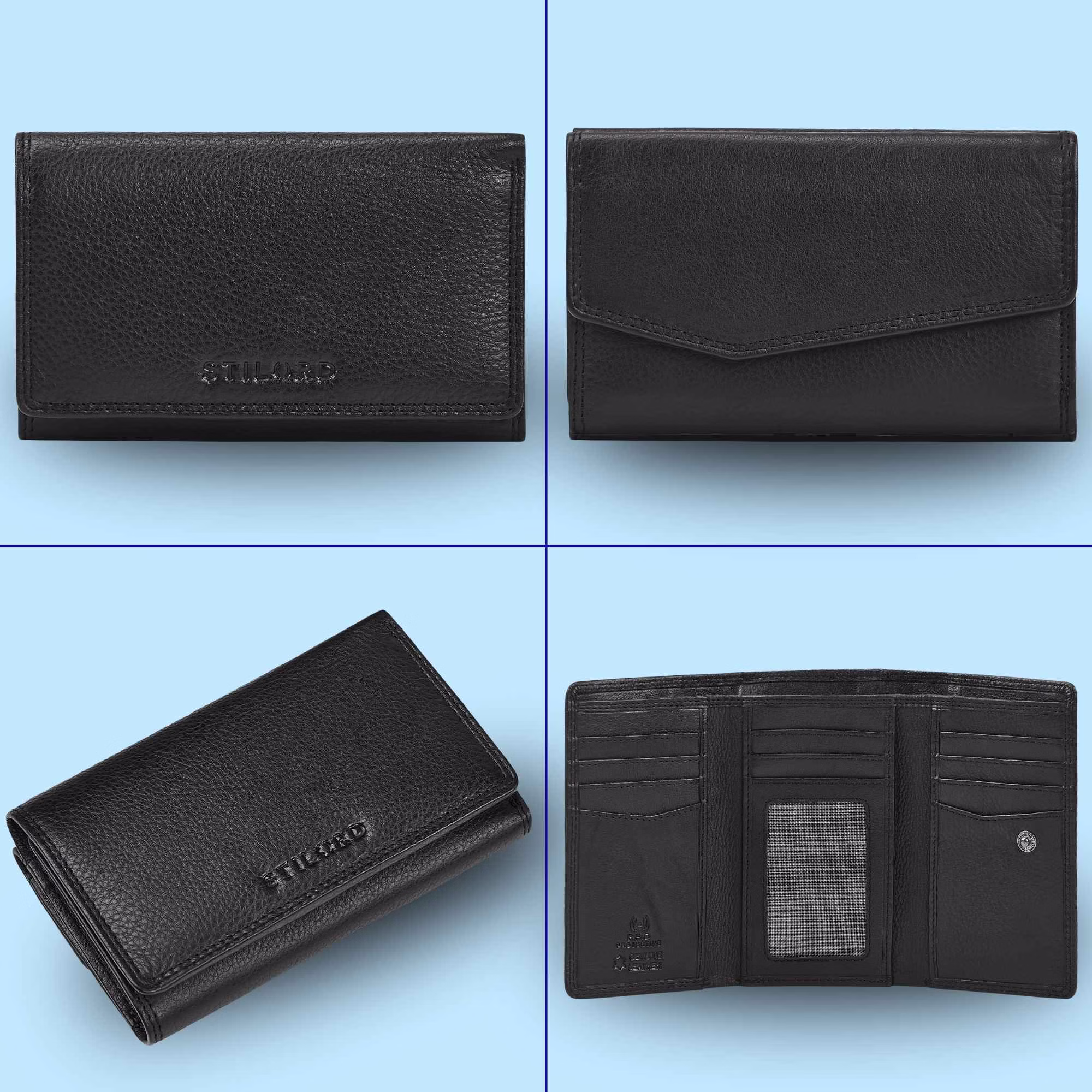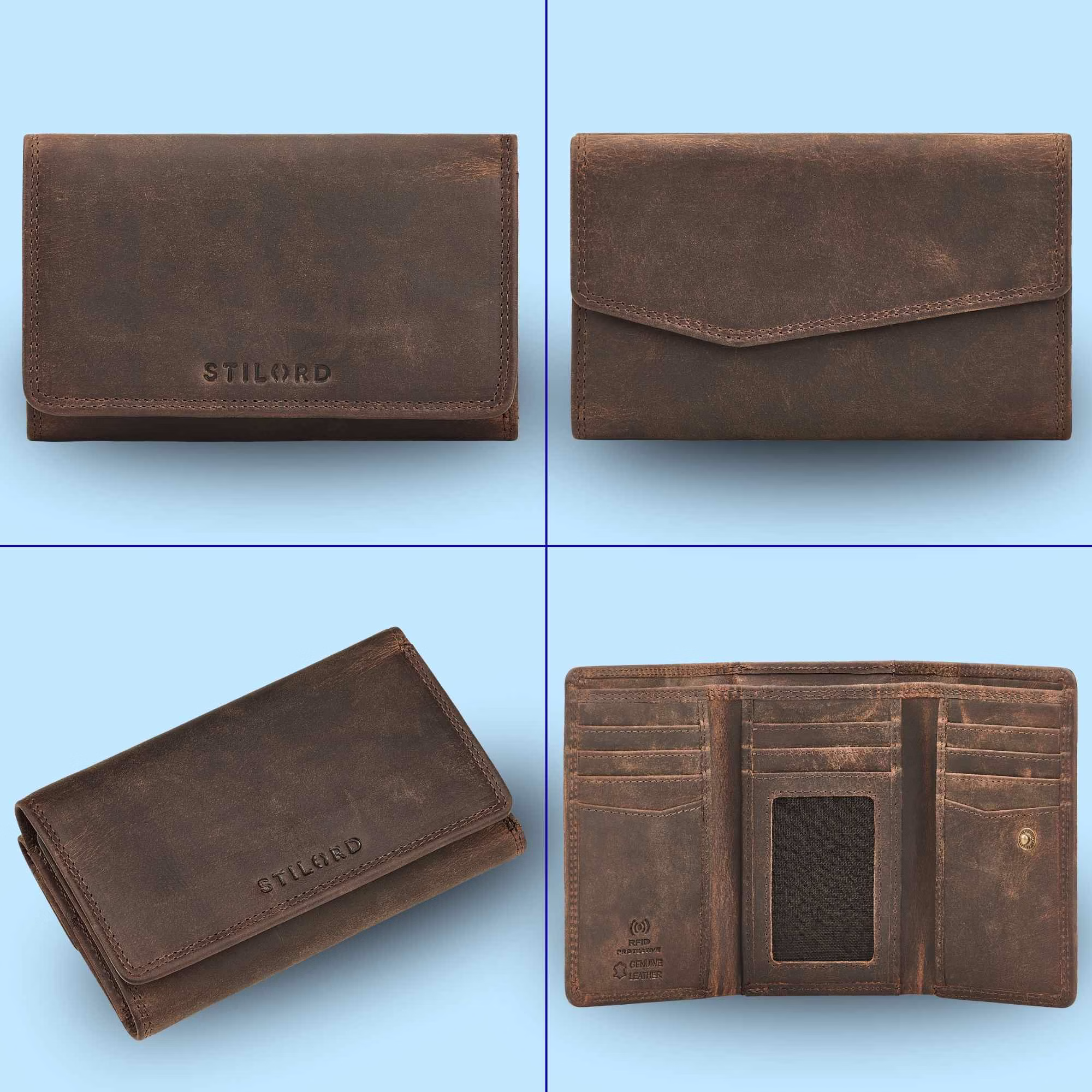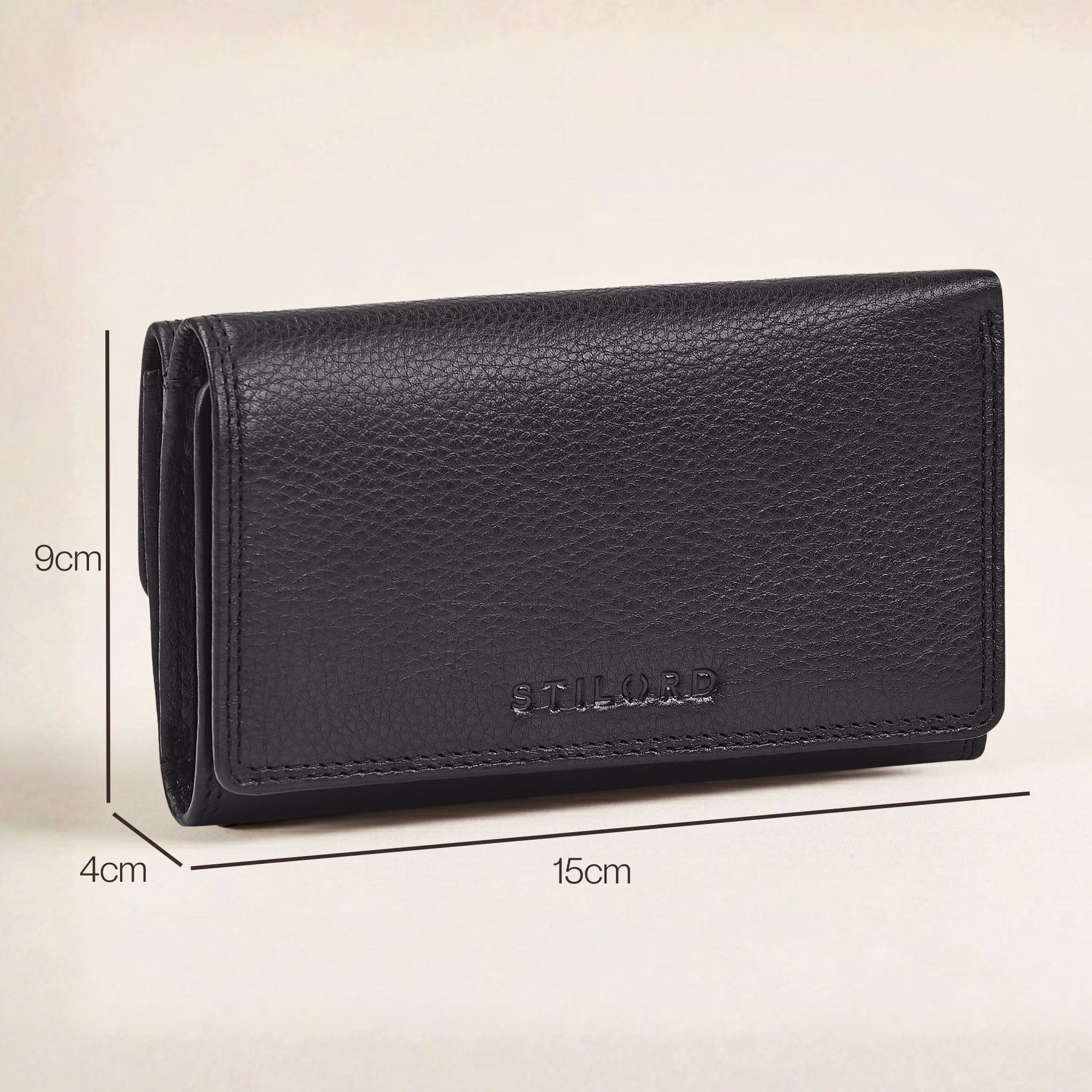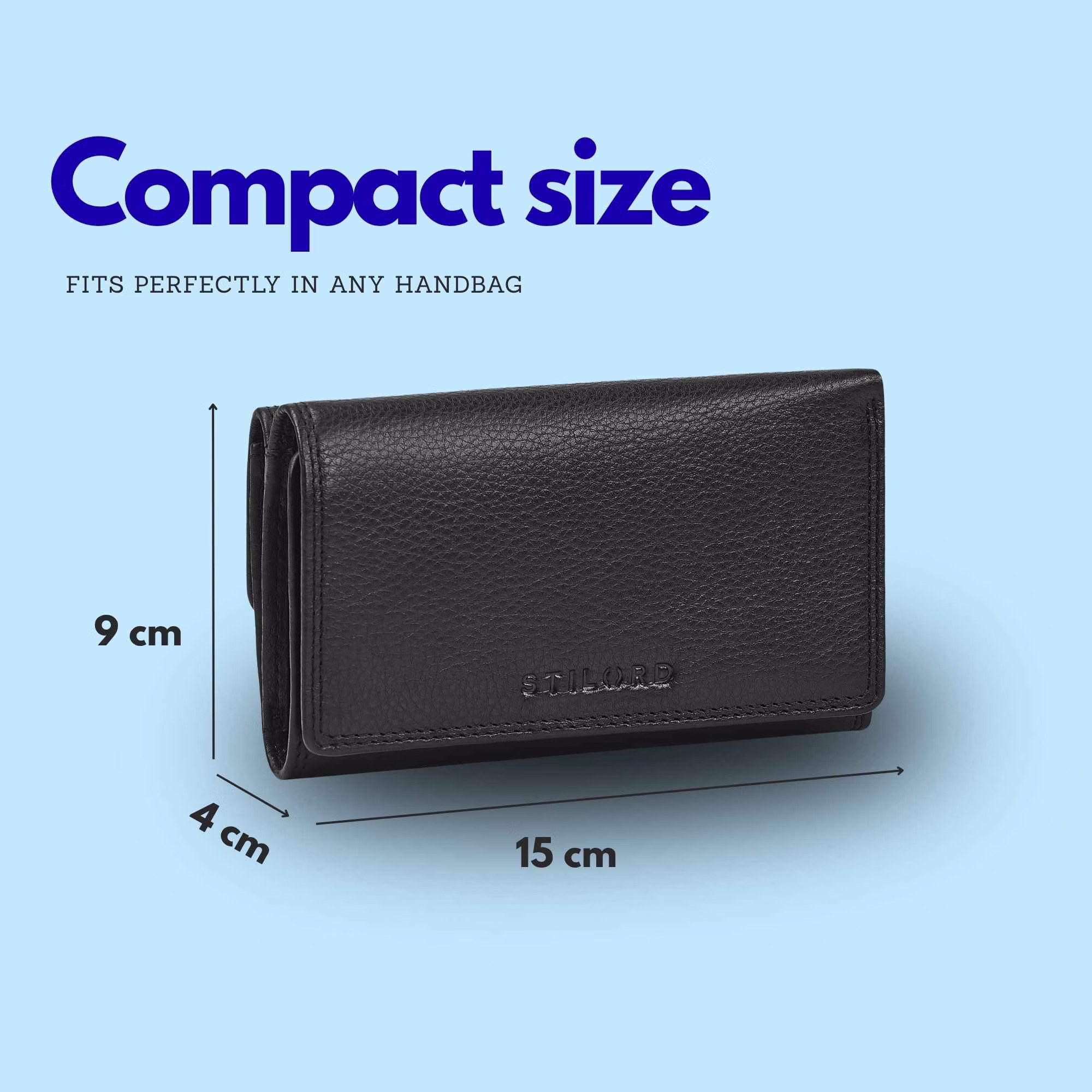 - Detalles: Medidas (LxAxH): 15 x 4 x 9 cm | Peso: 230 g | Modelo: "Daria" | Material: Cuero genuino | Marca: STILORD | Características destacadas: Protección RFID, compartimentos adicionales