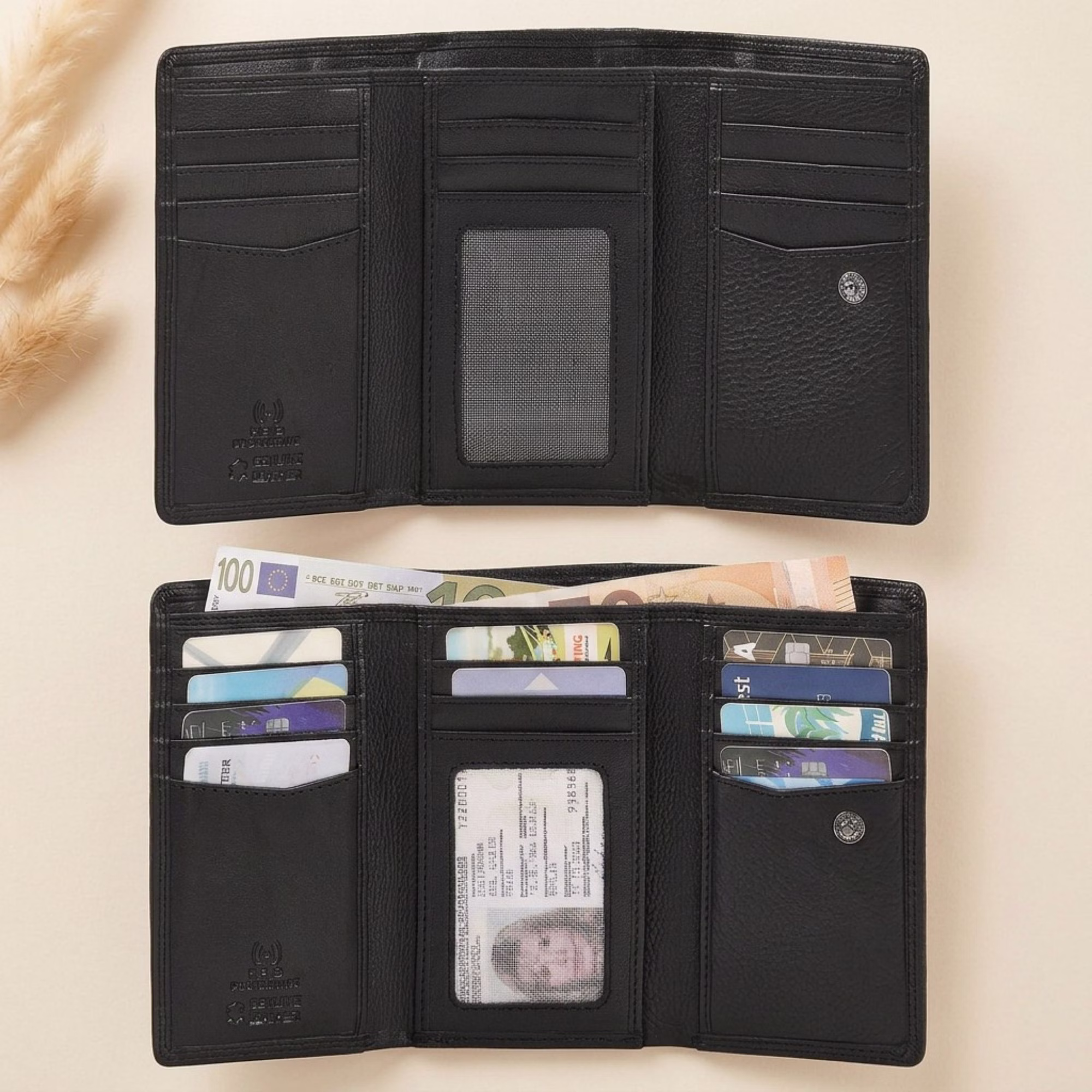 - Botón a presión ajustable: él cartera RFID cuero se adapta de forma flexible a la cantidad de contenido