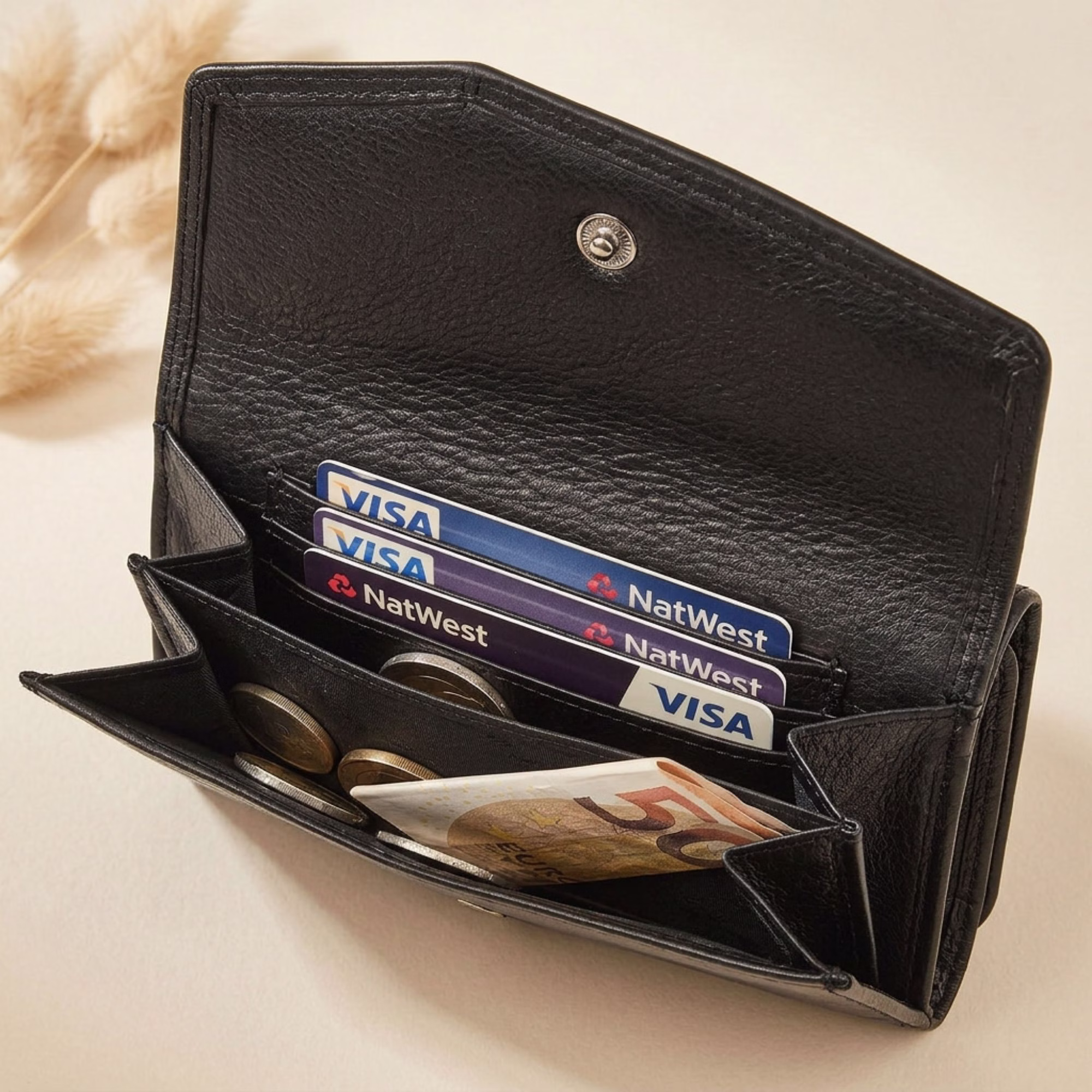- El monedero mujer grande se cierra de forma segura con un botón a presión, garantizando que el contenido esté siempre protegido