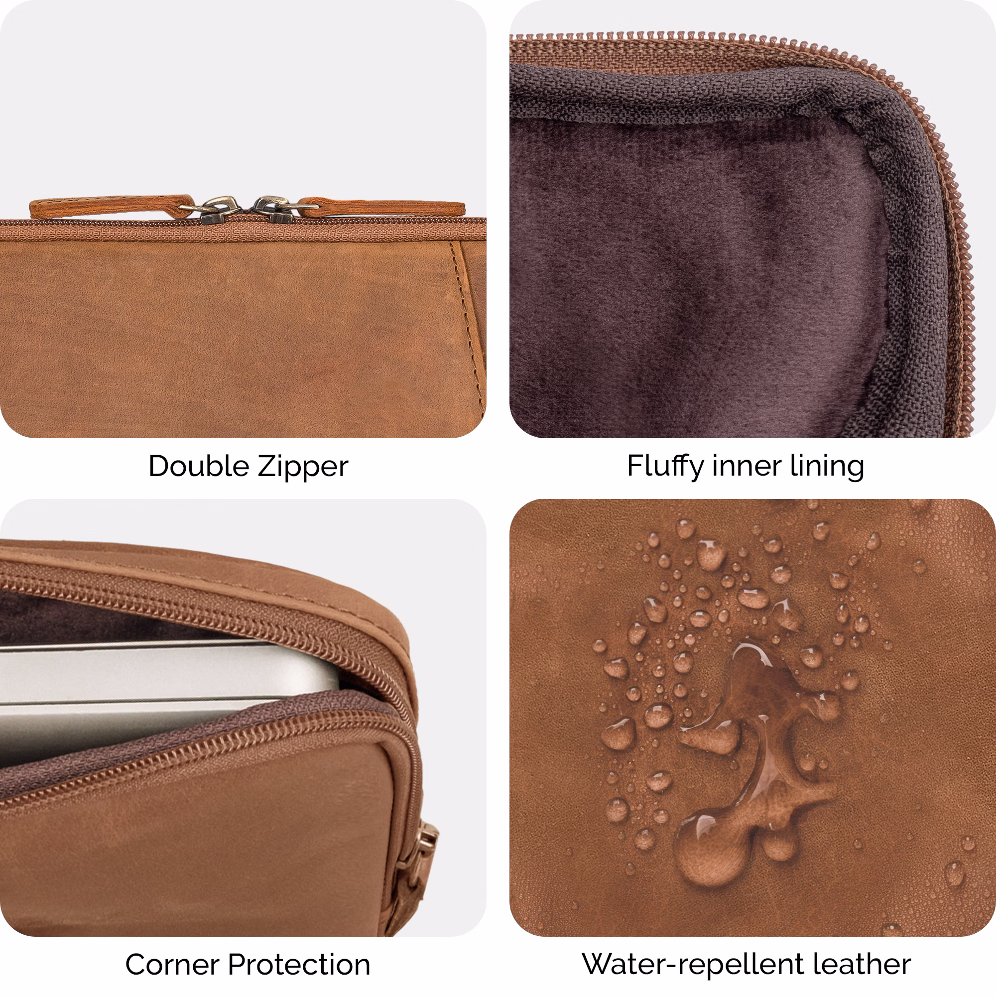- PROTECCIÓN COMPLETA CON ESTILO: Interior suave, esquinas reforzadas, doble cremallera y piel auténtica repelente al agua ofrecen seguridad y estilo en una sola funda. Tu tecnología, siempre protegida.