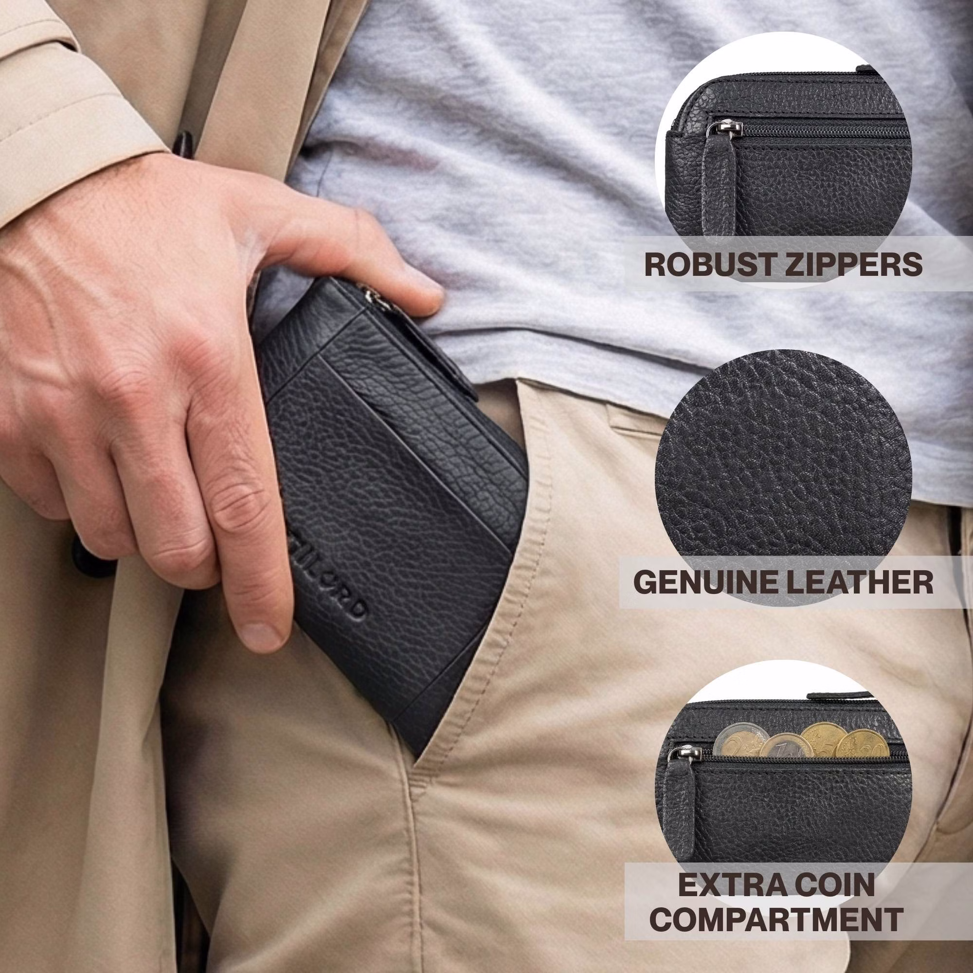 - BOLSILLO EXTRA CON CREMALLERA PARA MONEDAS: Compartimento trasero independiente para monedas en la bolsa de cuero para llaves, cerrado de forma segura y de acceso rápido – complementado con 2 cadenas para llaves en el compartimento principal y un práctico bolsillo frontal para tarjetas