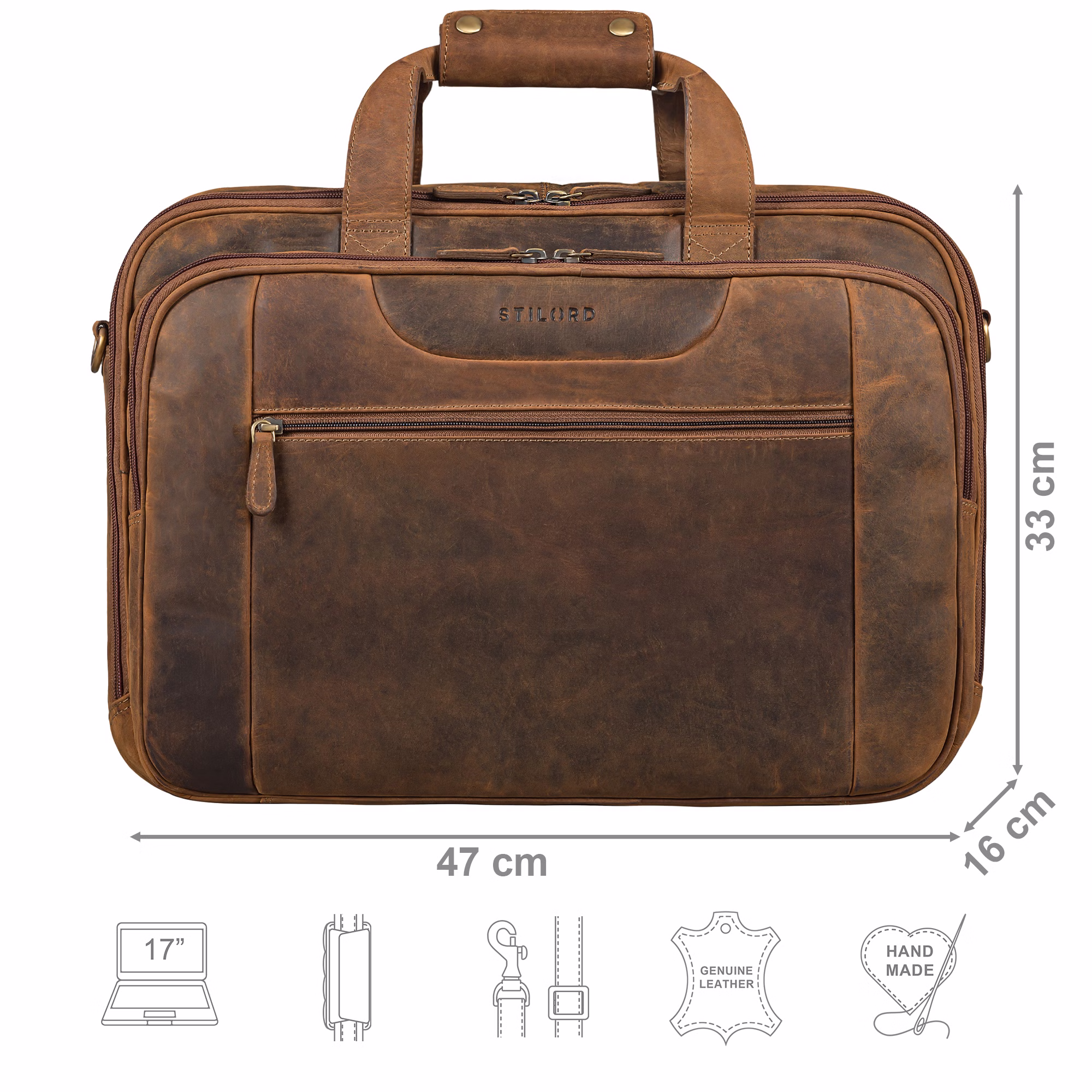 - Dimensiones: aprox. 47 x 16 x 33 cm | Modelo: Knut | Peso: 2005 g | Material: piel de vaca | Fabricante: STILORD | Compatibilidad: portátiles de 17 pulgadas en el compartimento acolchado para portátil (An x Al: 41 x 30 cm)