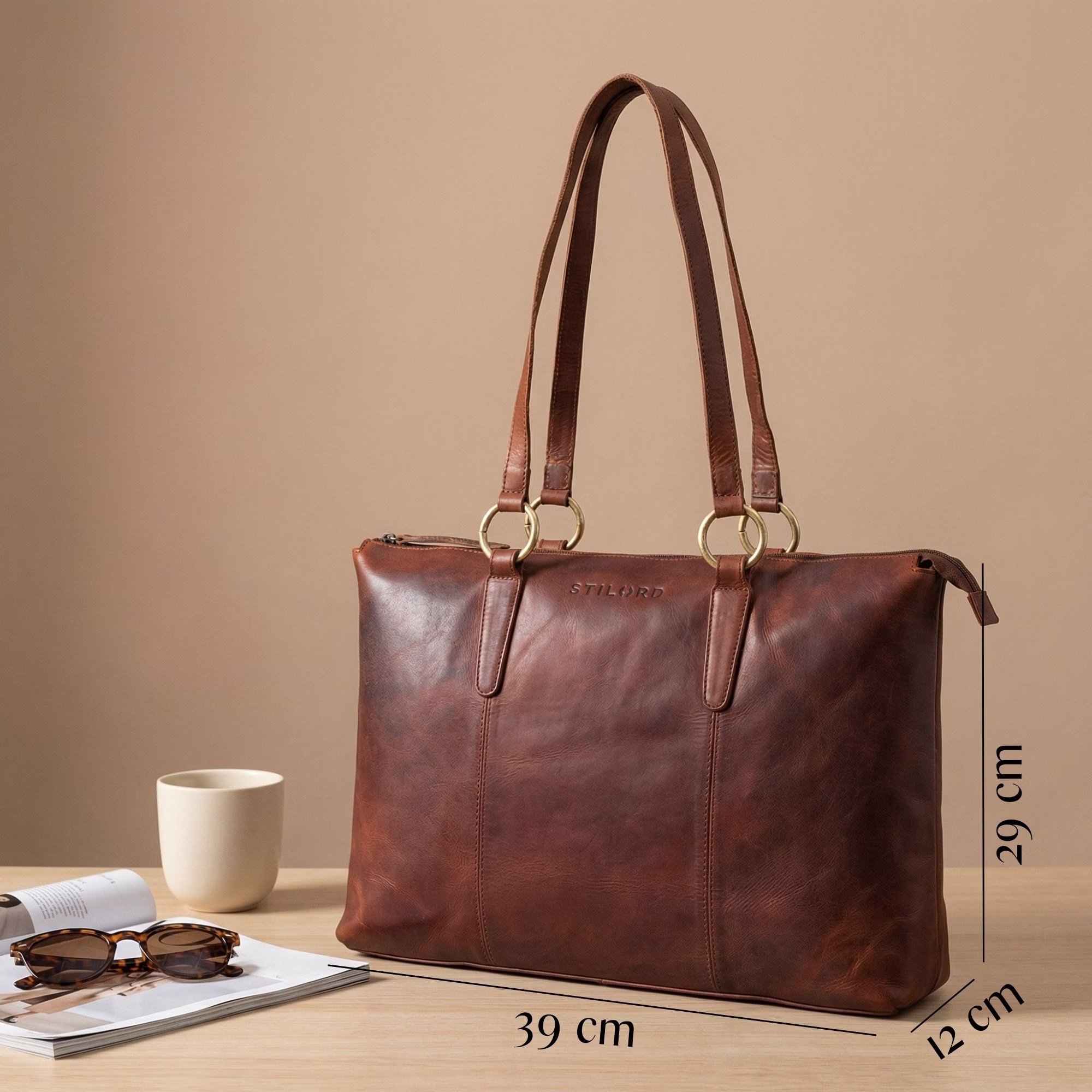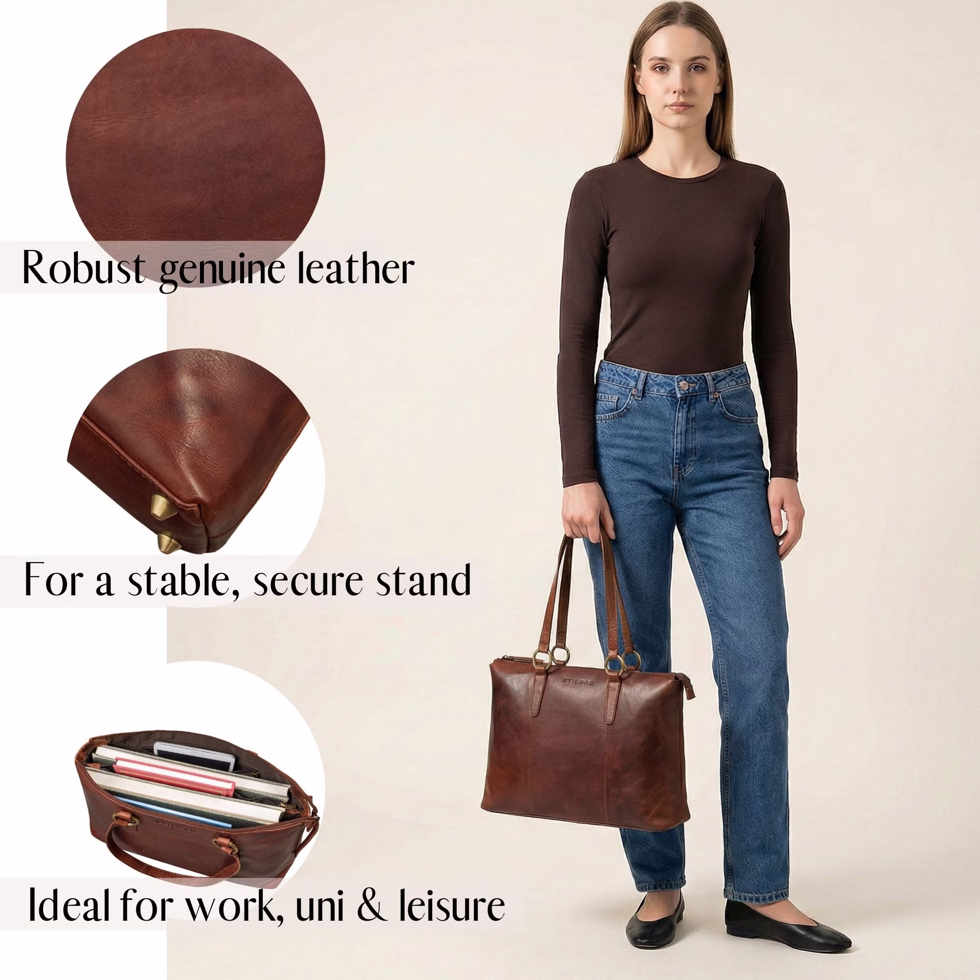 - DETALLES: Medidas (LxAxH): 39 x 12 x 29 cm | Peso: 740 g | Modelo: "Pelin" | Material: Cuero de vaca | Marca: STILORD | Compatible con laptops de 16 pulgadas | Características: Divisor con cremallera, 2 bolsillos grandes, cierre con cremallera.