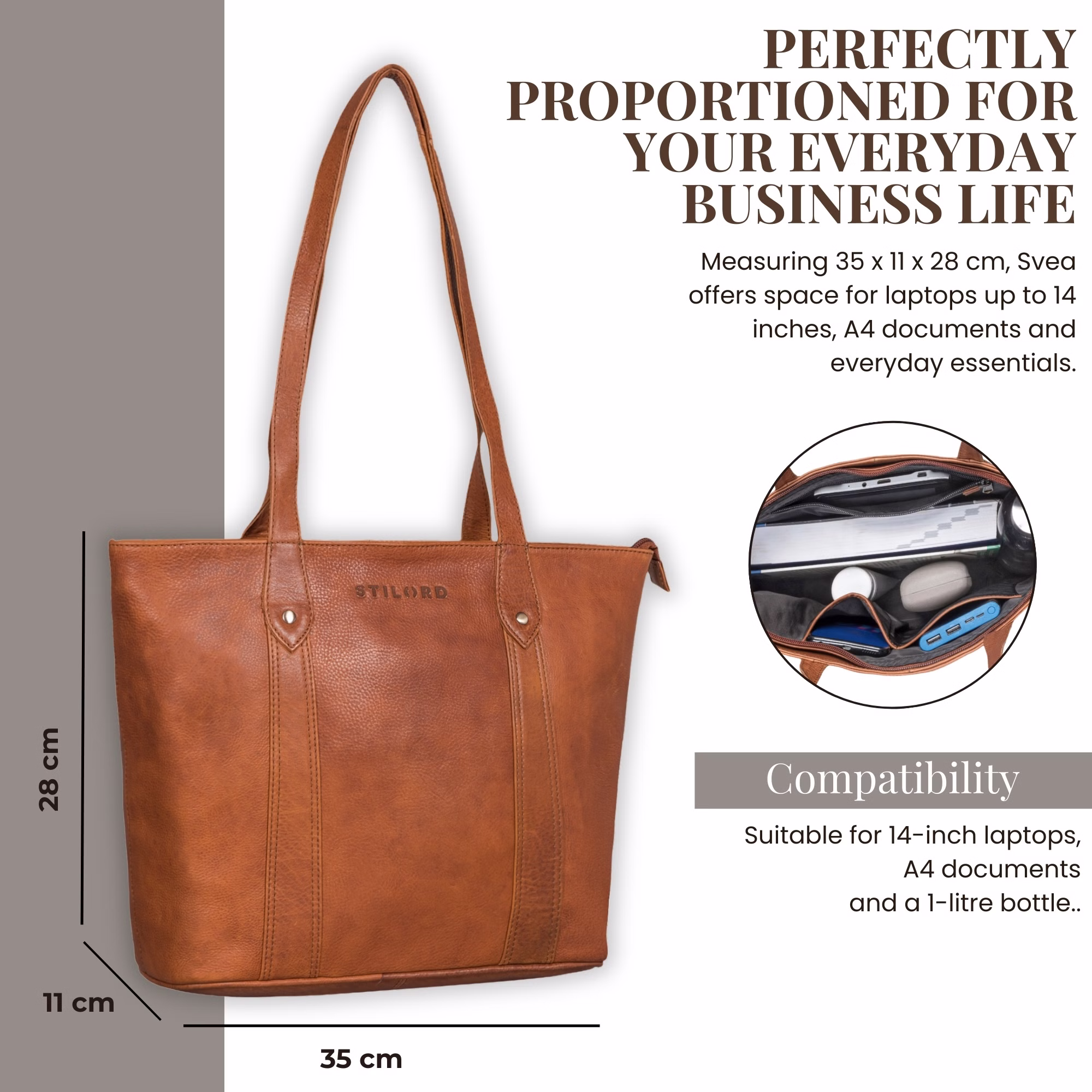 - DETAILS: Dimensiones: 35 x 11 x 28 cm. | Peso: 635 g. | Material: cuero genuino | Modelo: Svea | Marca: STILORD | Compatibilidad: portátil de 14 pulgadas, documentos DIN A4, botella de 1 L | Destacados: distribución interior bien pensada, aspecto vintage atemporal.