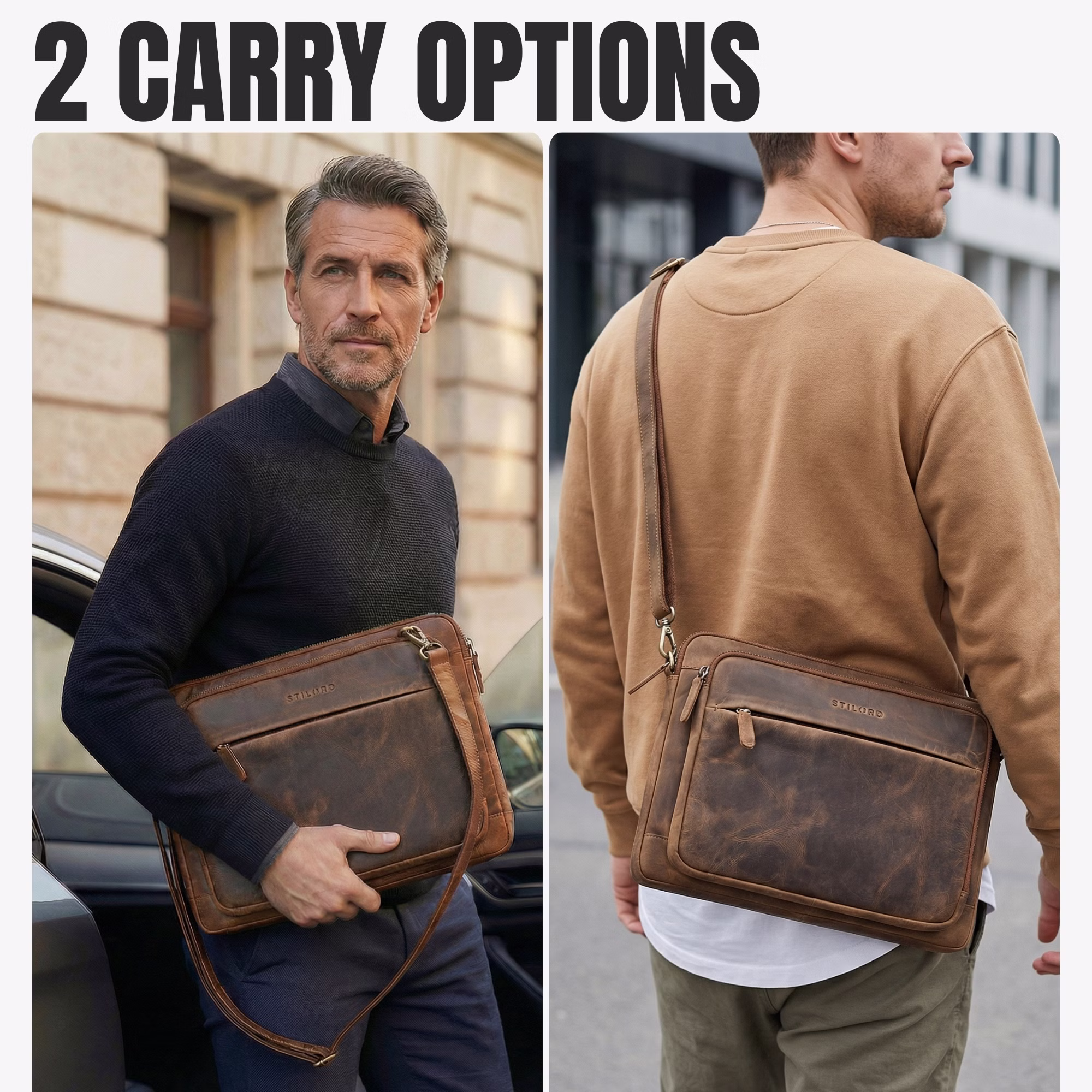 Gracias a la correa ajustable y extraíble, puedes llevarla como sleeve minimalista bajo el brazo o como bandolera tipo crossbody, adaptándose a tu ritmo diario: oficina, universidad, reuniones o trabajo en movilidad. El cuero auténtico, resistente al agua, combina durabilidad y estilo atemporal en una bolsa para portátil pensada para el hombre actual.