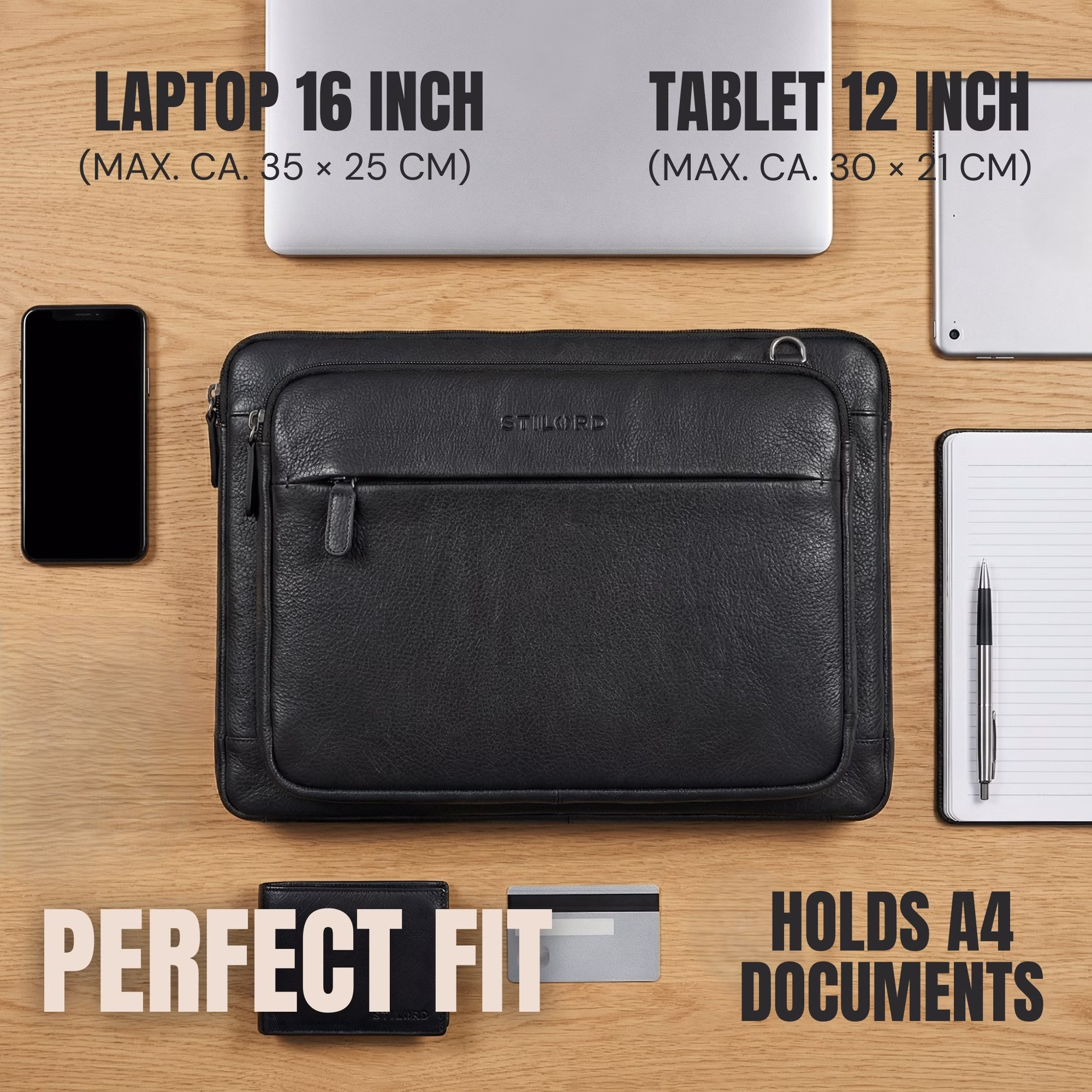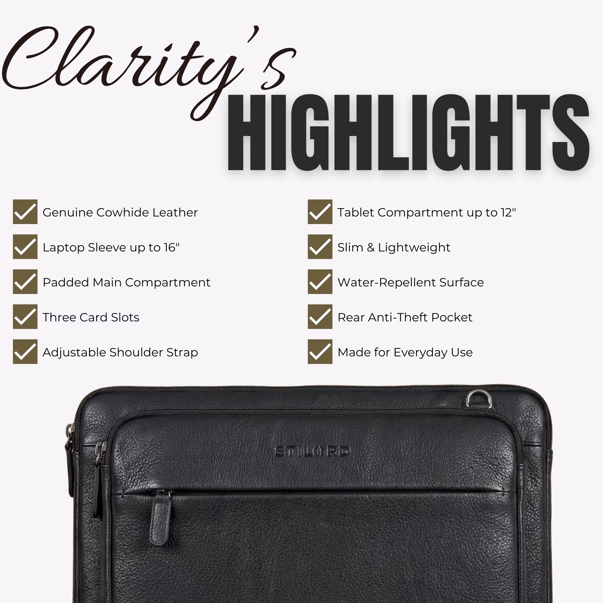 Bolsa cuero para portátil 15–16” con correa – Ventajas principales: