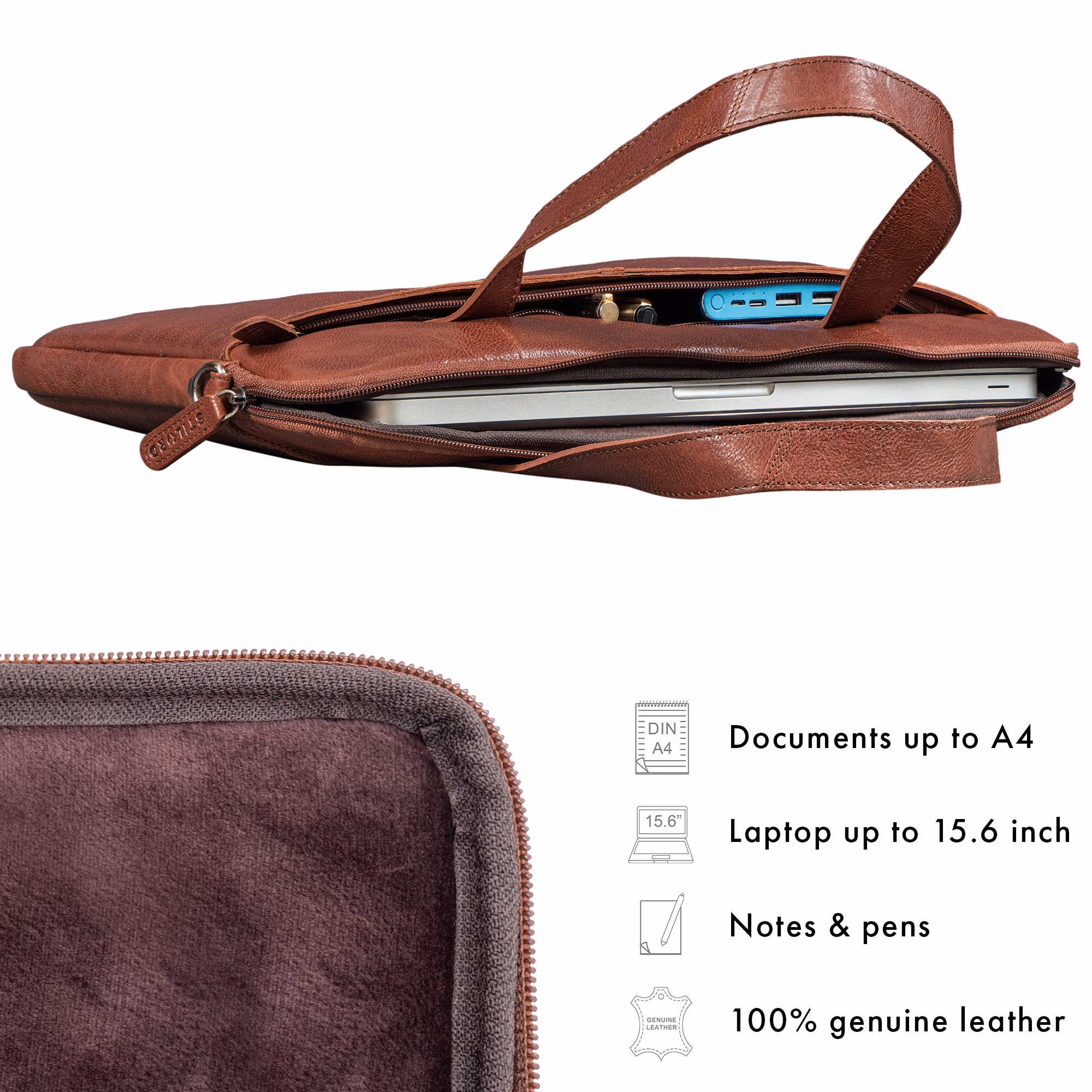 - Cuero auténtico con carácter: fabricada con cuero de alta calidad, suave y resistente, que destaca por su textura natural y durabilidad – cada maletin de cuero para portátil es una pieza única.