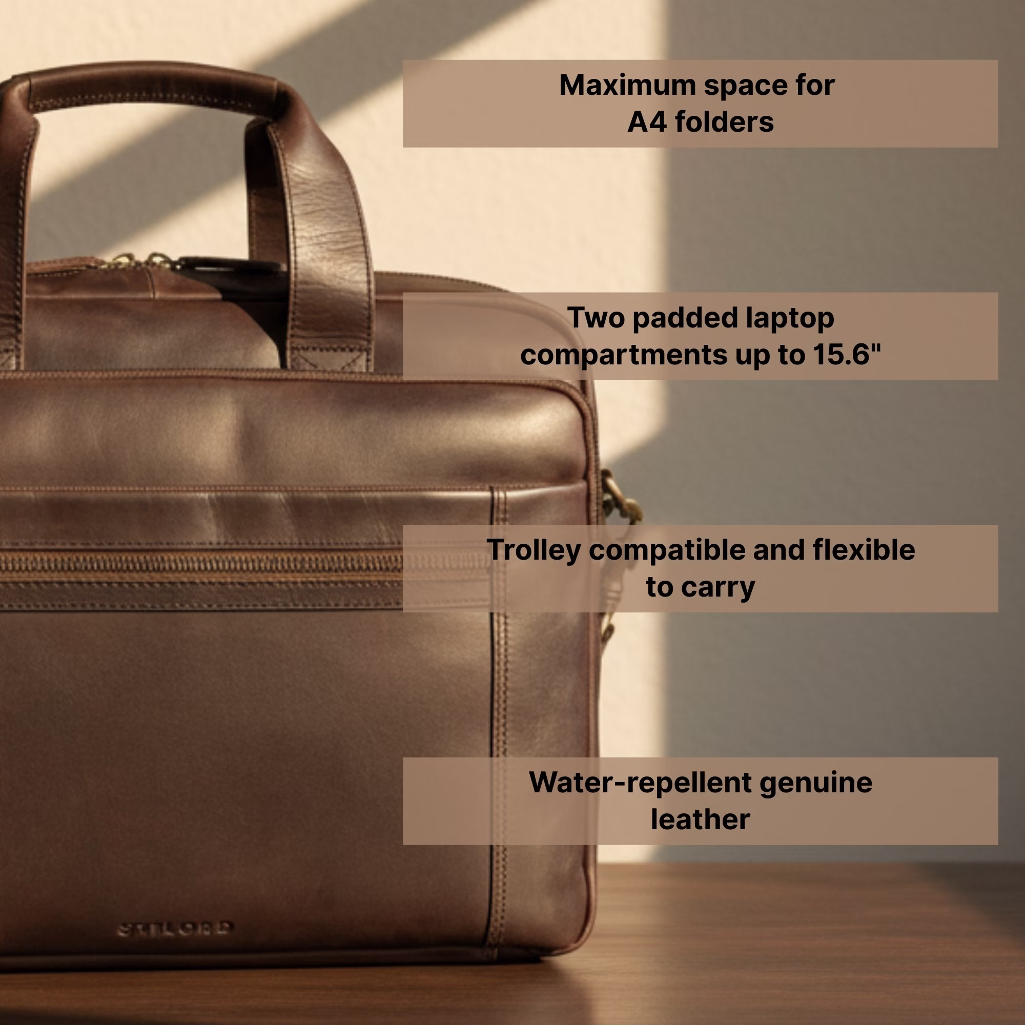 Descubre una nueva forma de organización profesional. "Alberto" une cuero auténtico de acabado natural con un diseño pensado para quienes buscan estilo y eficiencia en su día a día. Ofrece espacio para documentos DIN A4 y carpetas anchas, sin perder esa presencia compacta que destaca tanto en la oficina como en viajes de negocios.