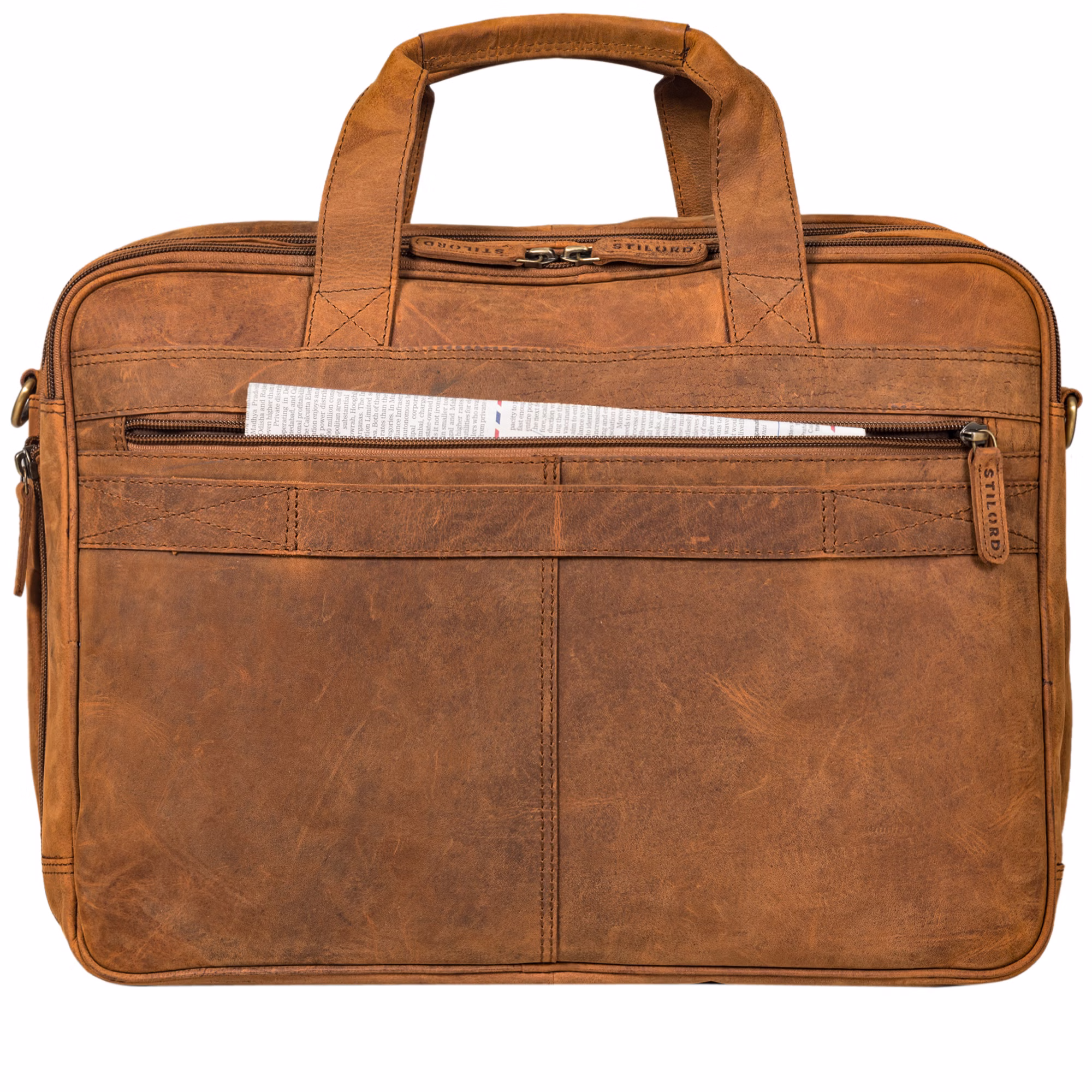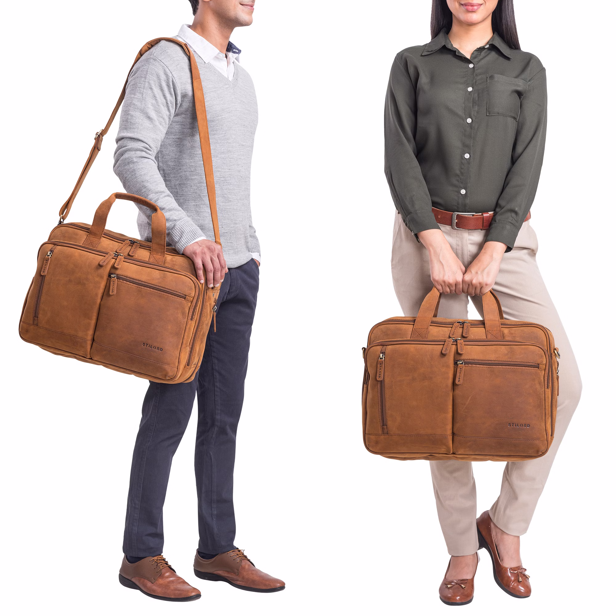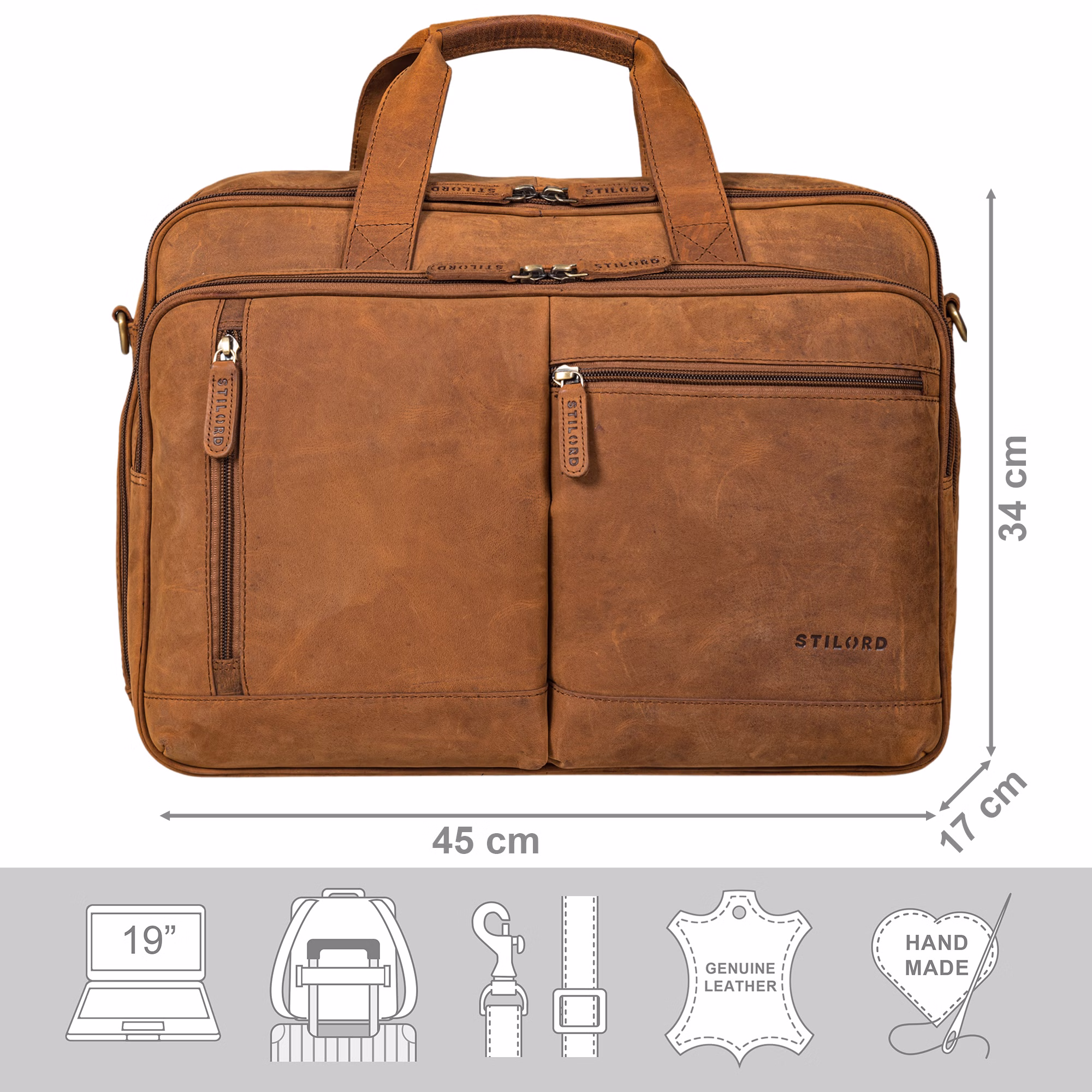 - Dimensiones (L x A x A): aprox. 45 x 17 x 34 cm | Modelo: Arnold | Peso: 1970 gramos | Material: cuero de vaca | Fabricante: STILORD | Compatibilidad: 1. compartimento acolchado (42 x 23 cm) para portátiles de 17 a 19 pulgadas | 2. compartimento acolchado para tablet de hasta 10,1 pulgadas