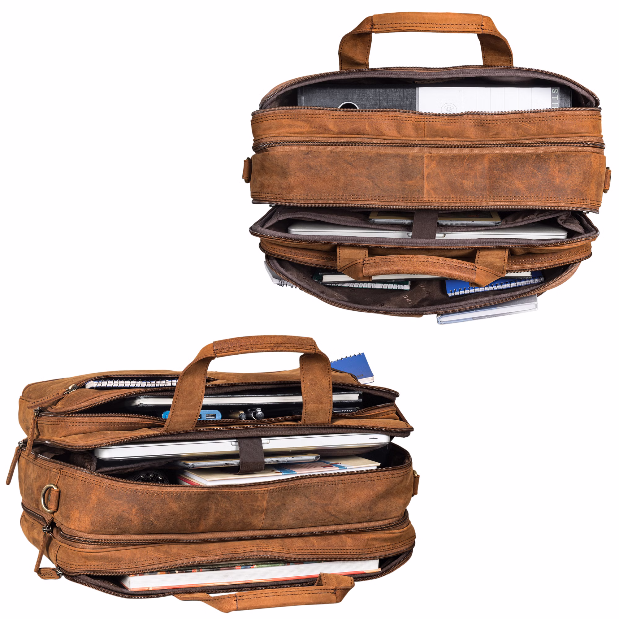 - Para tener aún más espacio, nuestro maletín grande de piel cuenta con una cremallera de expansión.