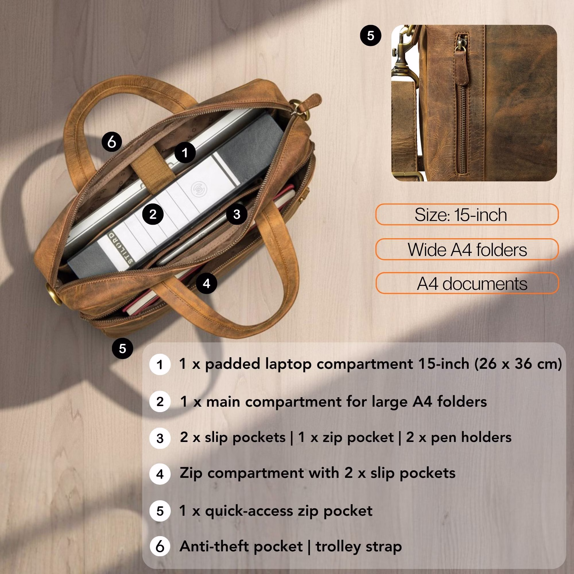 Todo de un vistazo – "Ramon" maletin portadocumentos hombre cuero diseñado para su día a día profesional