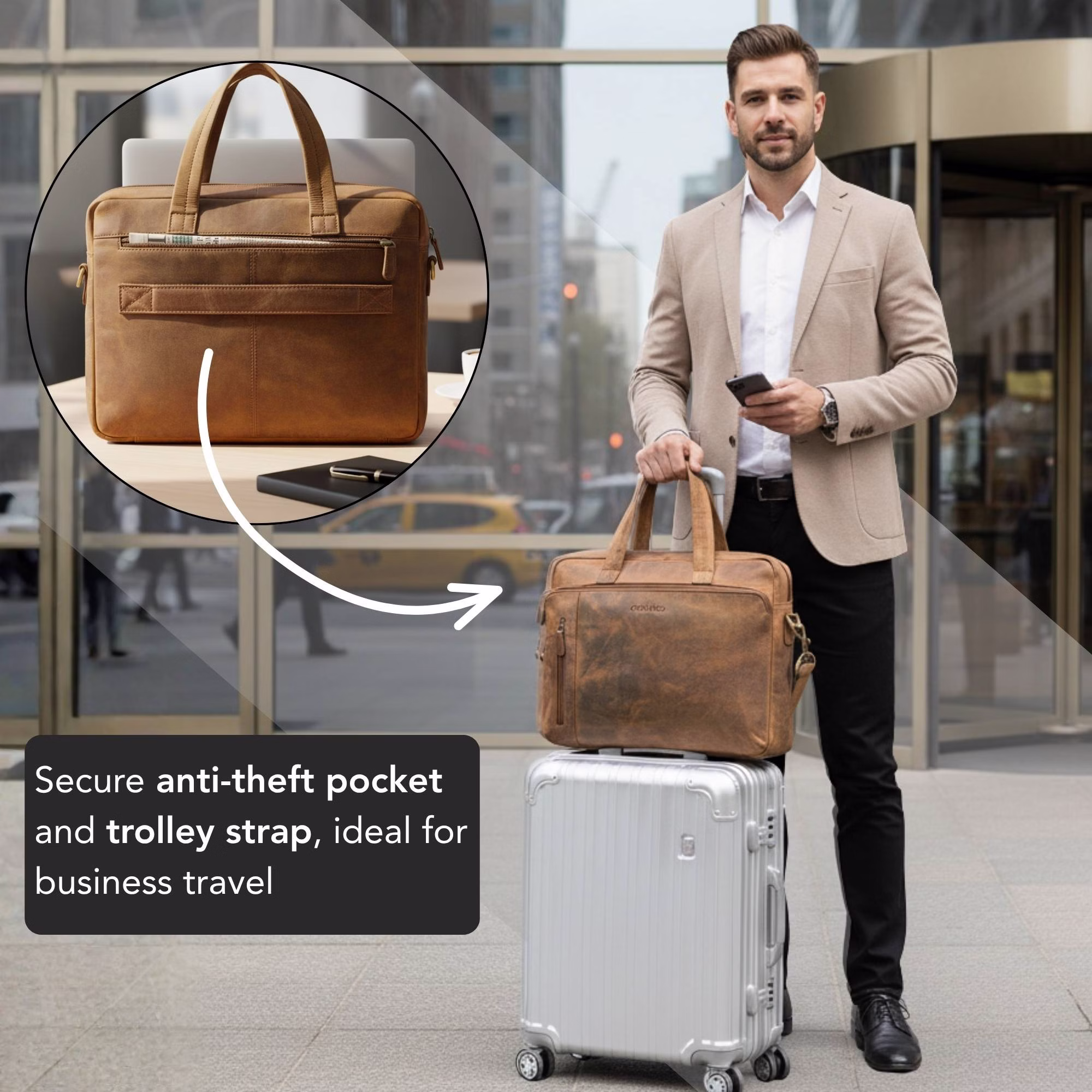 - CONFORT EMPRESARIAL: Bolsillo trasero antirrobo y práctica sujeción para trolley que facilitan los viajes de negocios. Una opción excelente para viajeros frecuentes que buscan una maletin de trabajo hombre piel fiable con un diseño bien pensado.