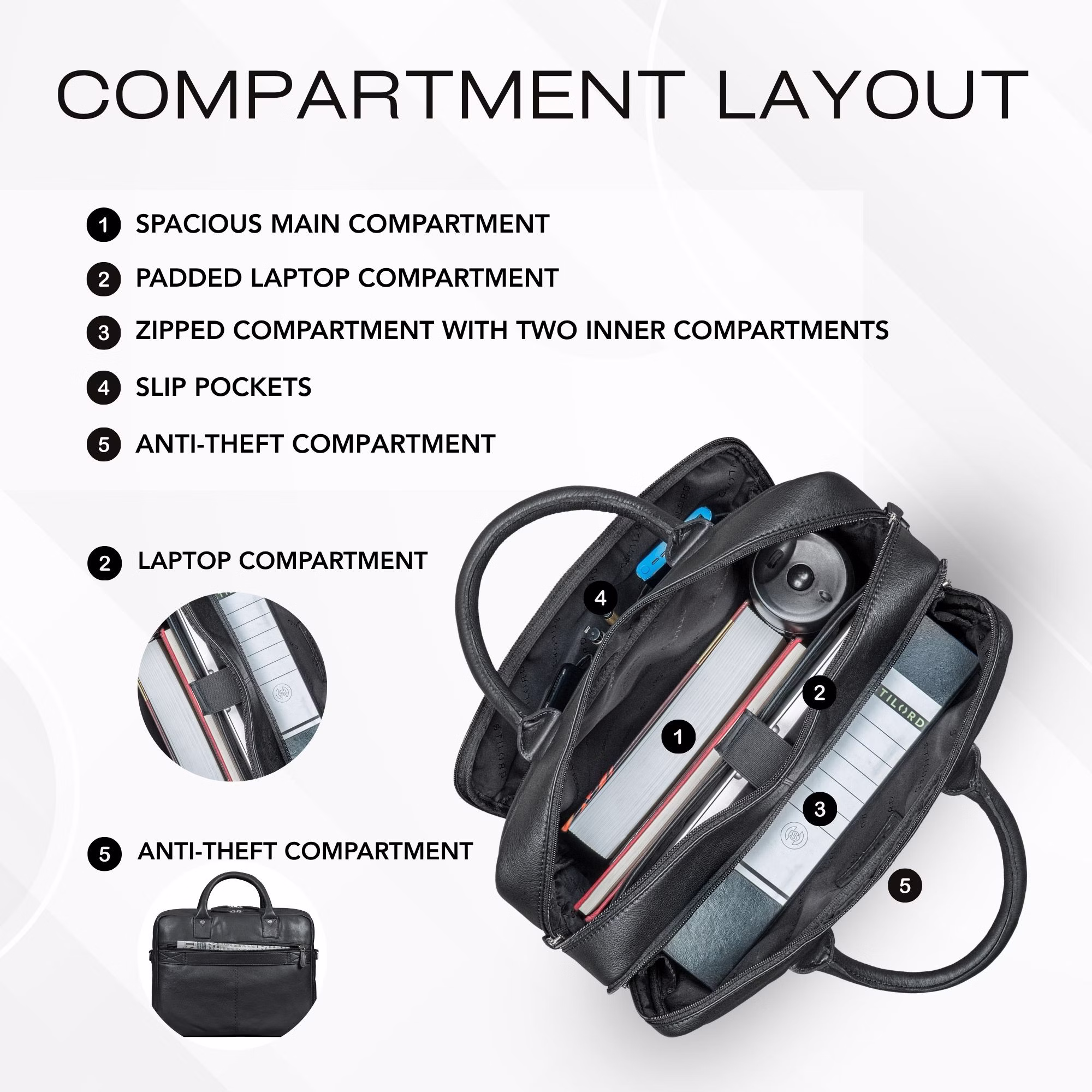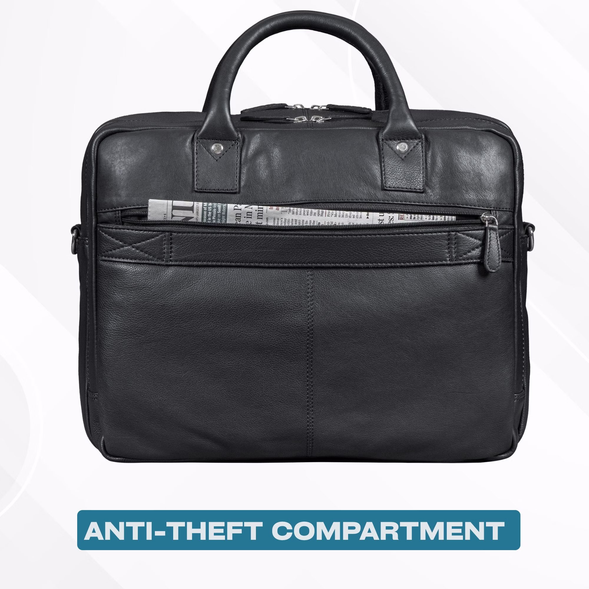 - ORGANIZACIÓN PARA TECNOLOGÍA Y DOCUMENTOS: Con un gran compartimento principal para carpetas DIN A4 anchas y compartimento acolchado para portátil (15,6 pulgadas), compartimento doble, varios bolsillos con cremallera y bolsillos abiertos, así como un bolsillo antirrobo, la maletin de trabajo cuero ofrece una organización perfecta en la rutina empresarial.