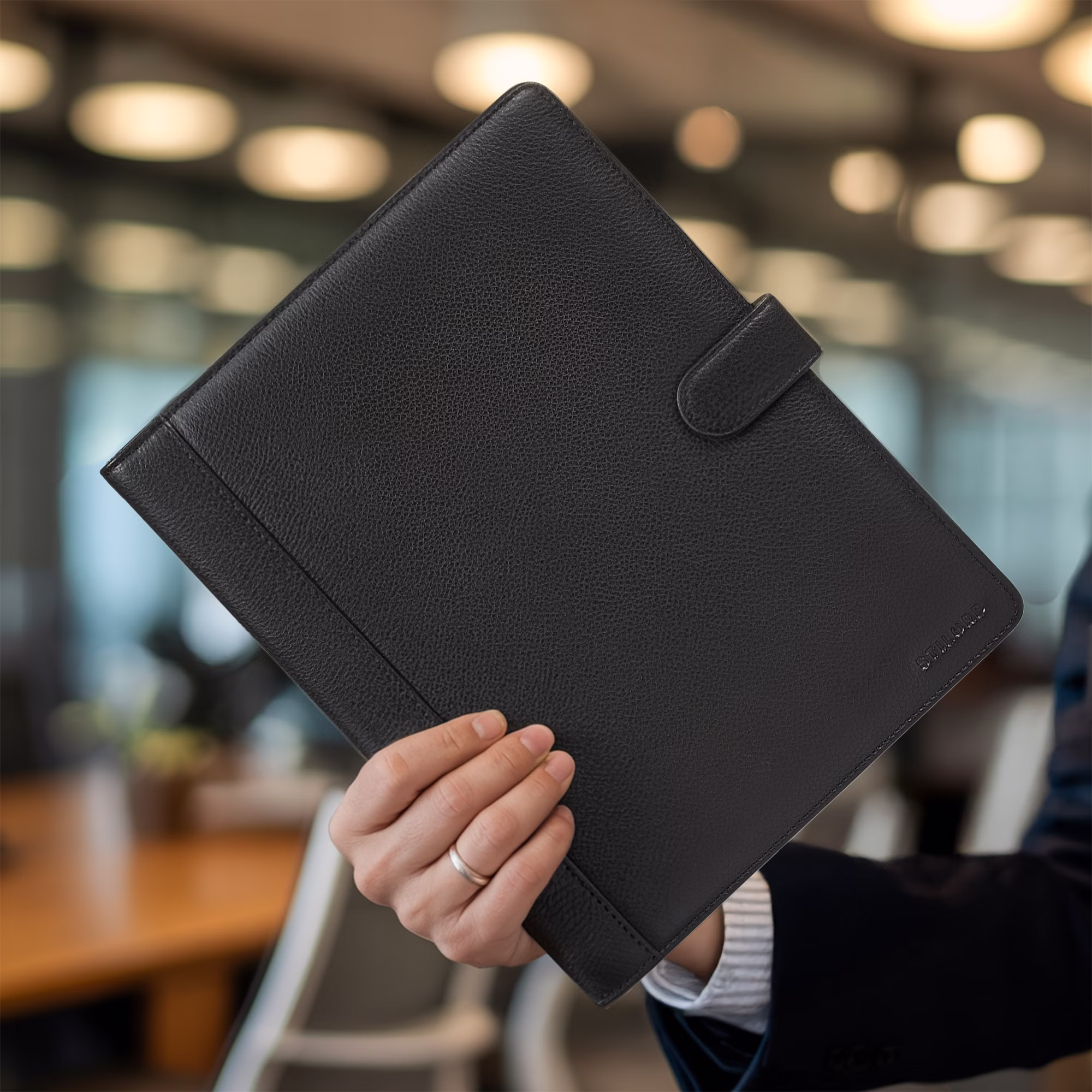 - PIEL DE BOVINO REAL: Impresione en cada cita, reunión o conferencia con esta carpeta conferencia piel de alta calidad. Con propiedades hidrófugas y una textura natural, cada carpeta negocios es única