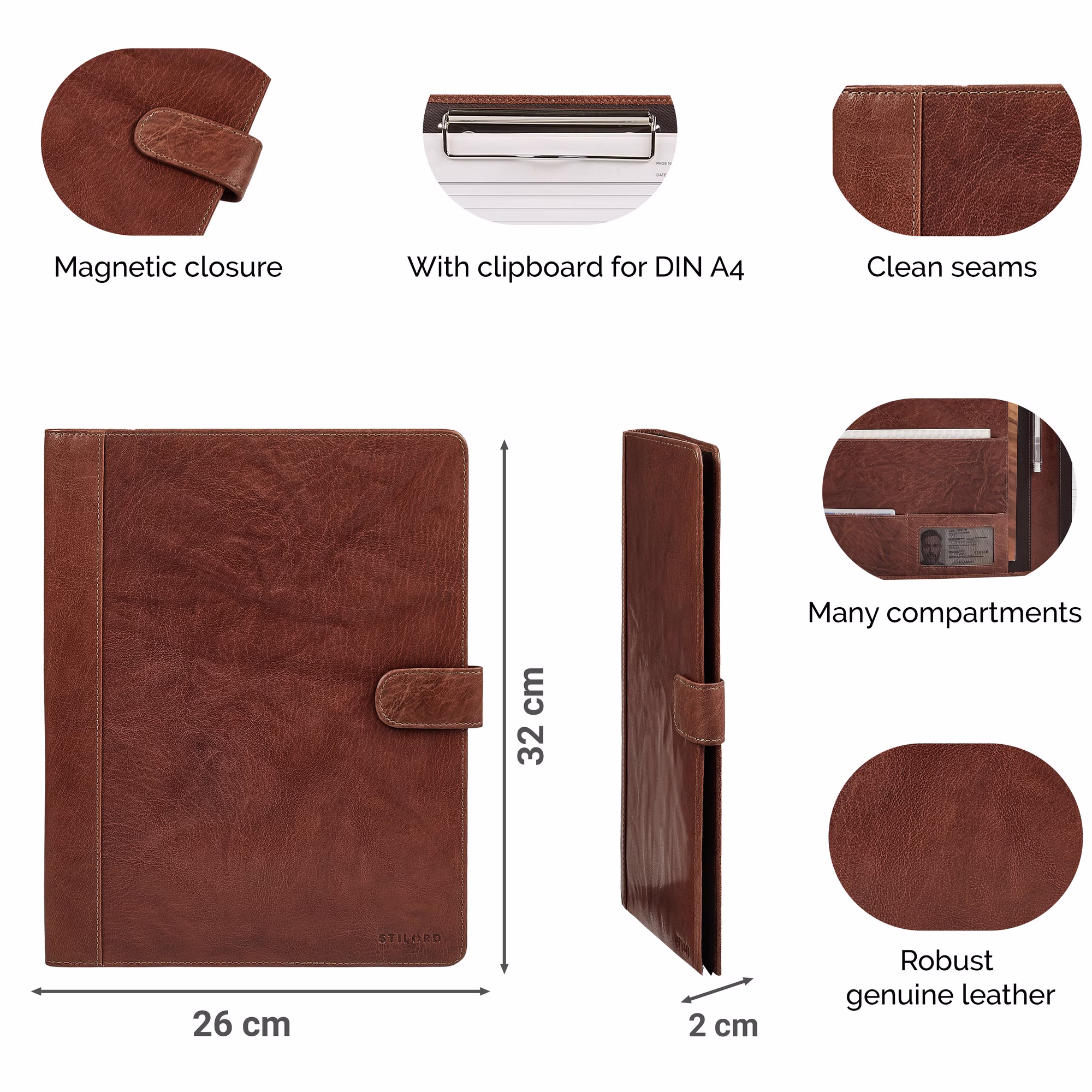 - DETALLES: (LxAxA): 26 x 2 x 32 cm | Peso: 560g | Modelo: "Raymond" | Marca: STILORD | Material: Piel auténtica | Compatibilidad: DIN A4 | Características especiales: Portapapeles y cierre magnético