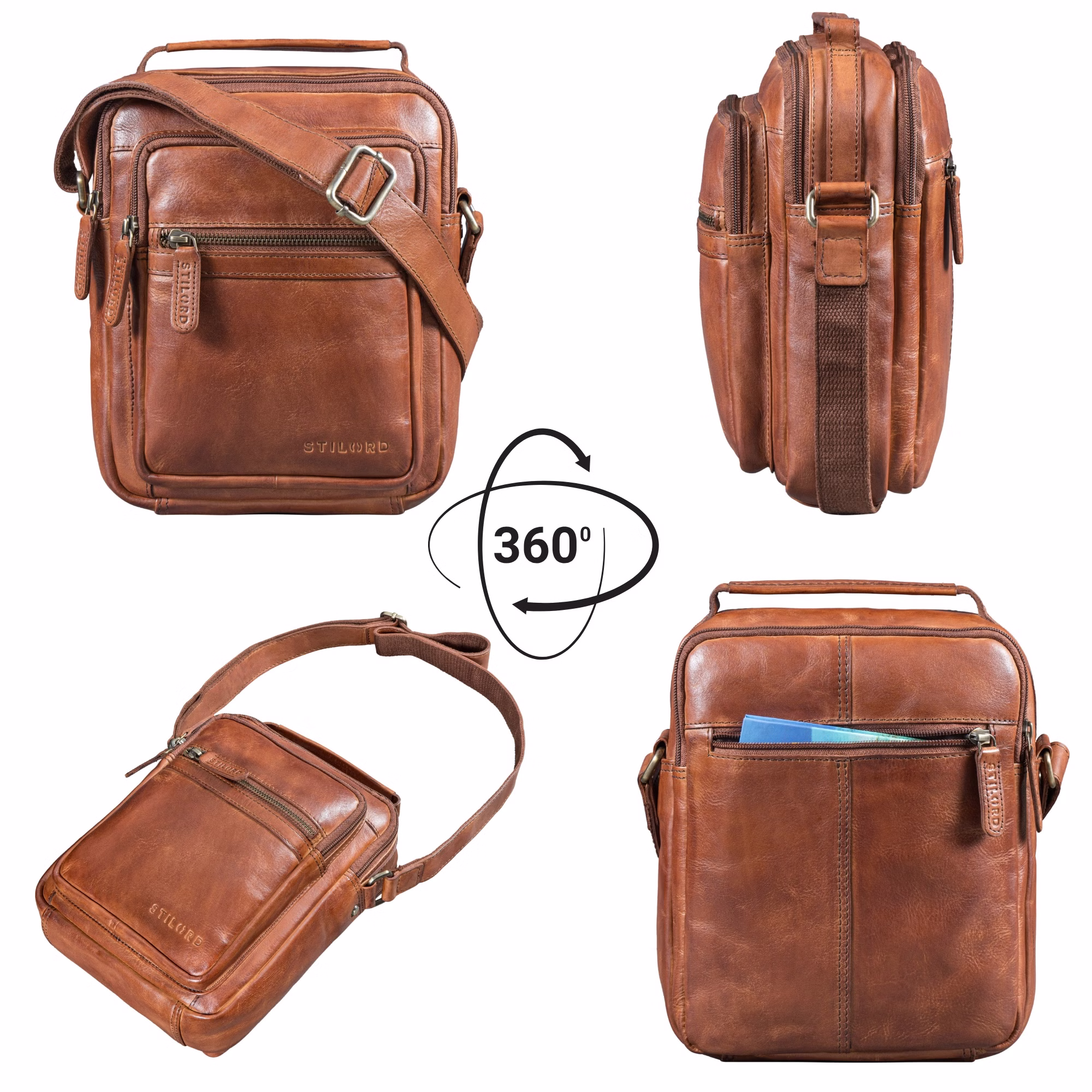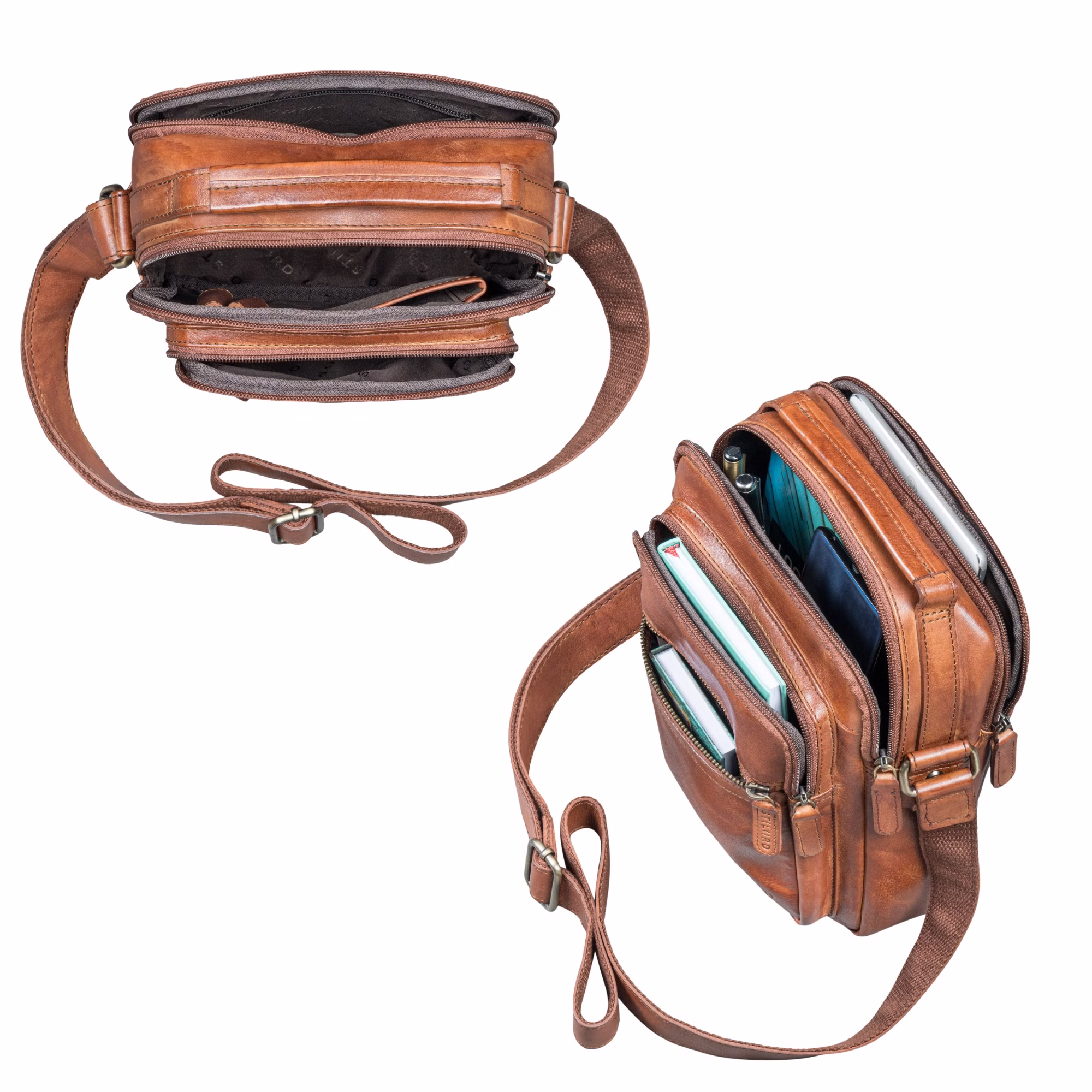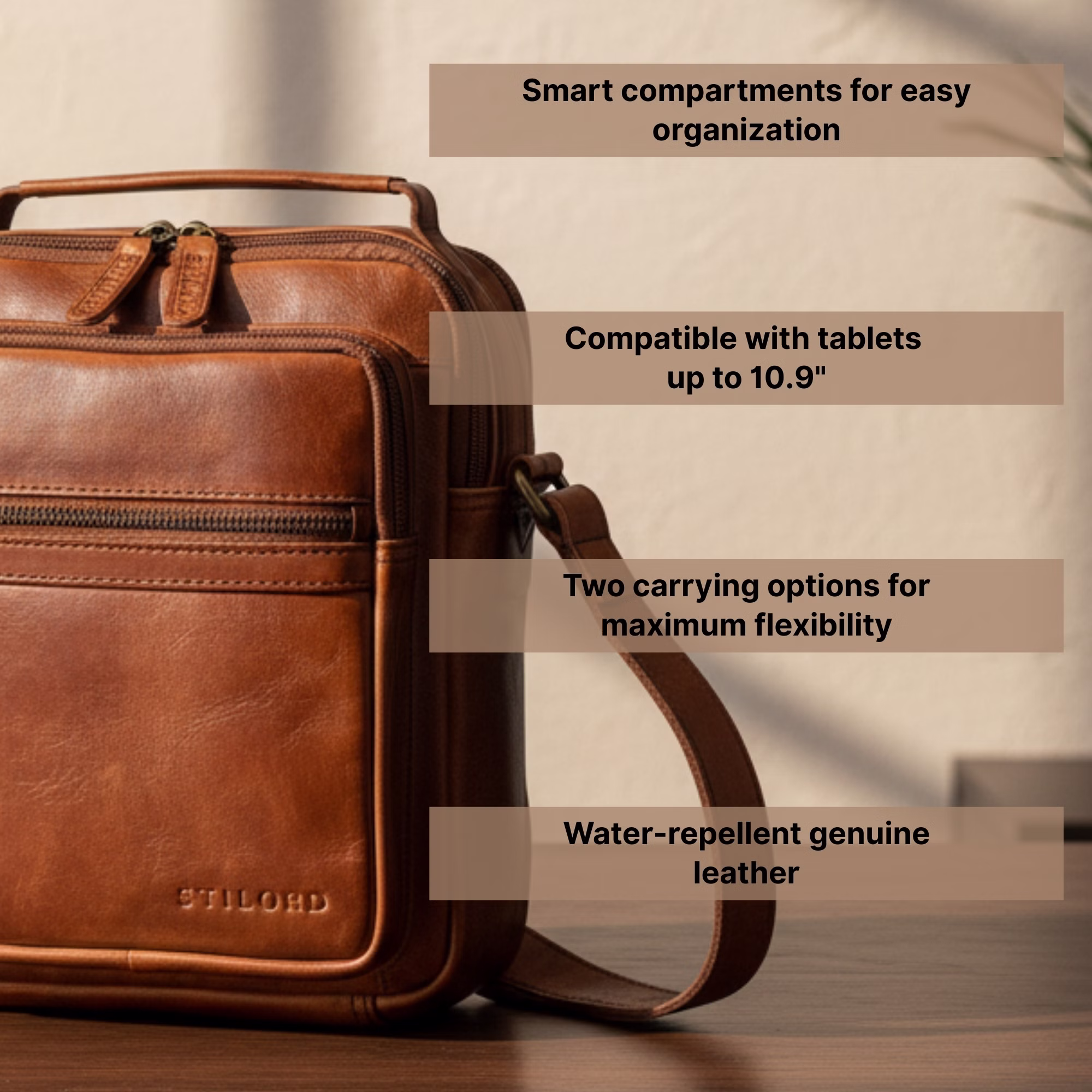 - ORGANIZACIÓN INTELIGENTE PARA TECNOLOGÍA Y VIDA DIARIA: Compartimento principal para tablet hasta 10,9 pulgadas, espacio para móvil, portabolígrafos, 2 bolsillos frontales con cremallera y bolsillo antirrobo en la parte trasera. Todo bien organizado en este práctico bolso de cuero para hombre.