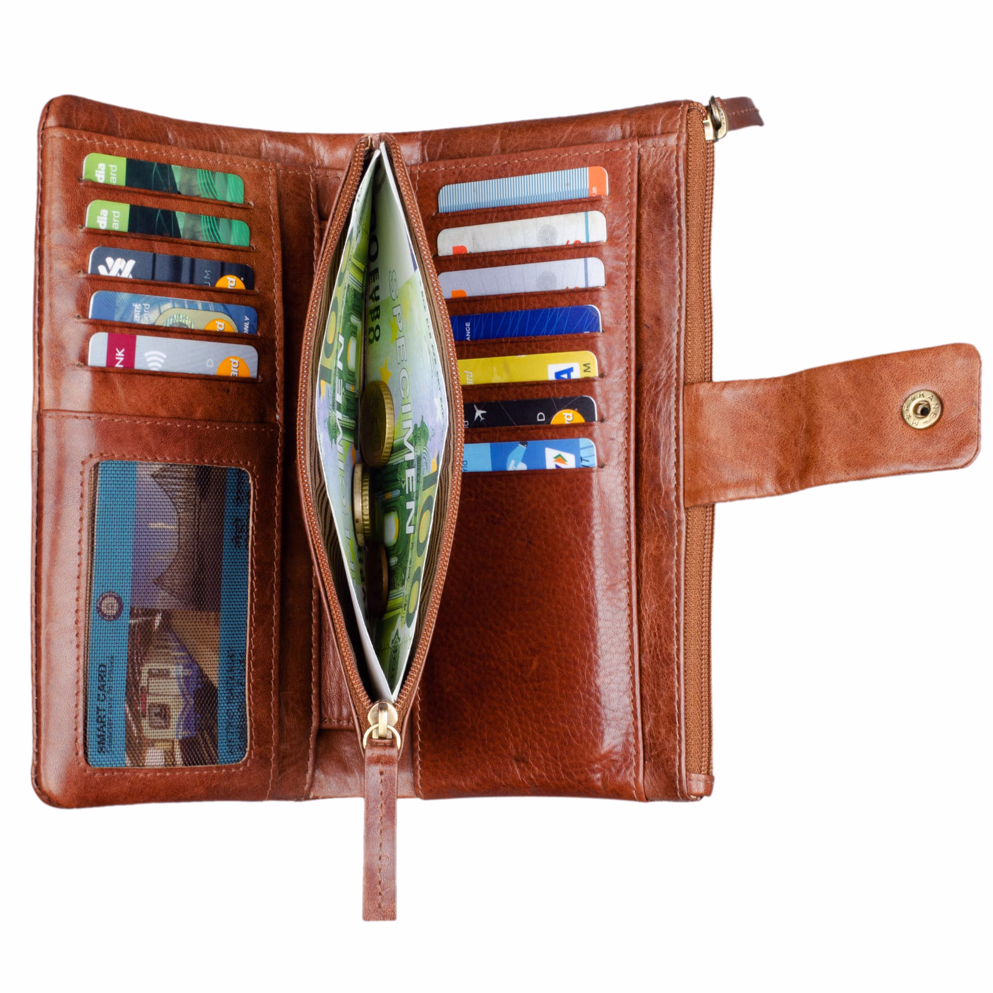 - Distribución: 19 x compartimento para la tarjeta EC | 1 x 1 x compartimento de rejilla para el DNI | 1 x compartimento para monedas con cremallera | 1 x compartimento grande con cremallera para billetes | 5 x bolsillos para dinero, recibos, billetes, etc.