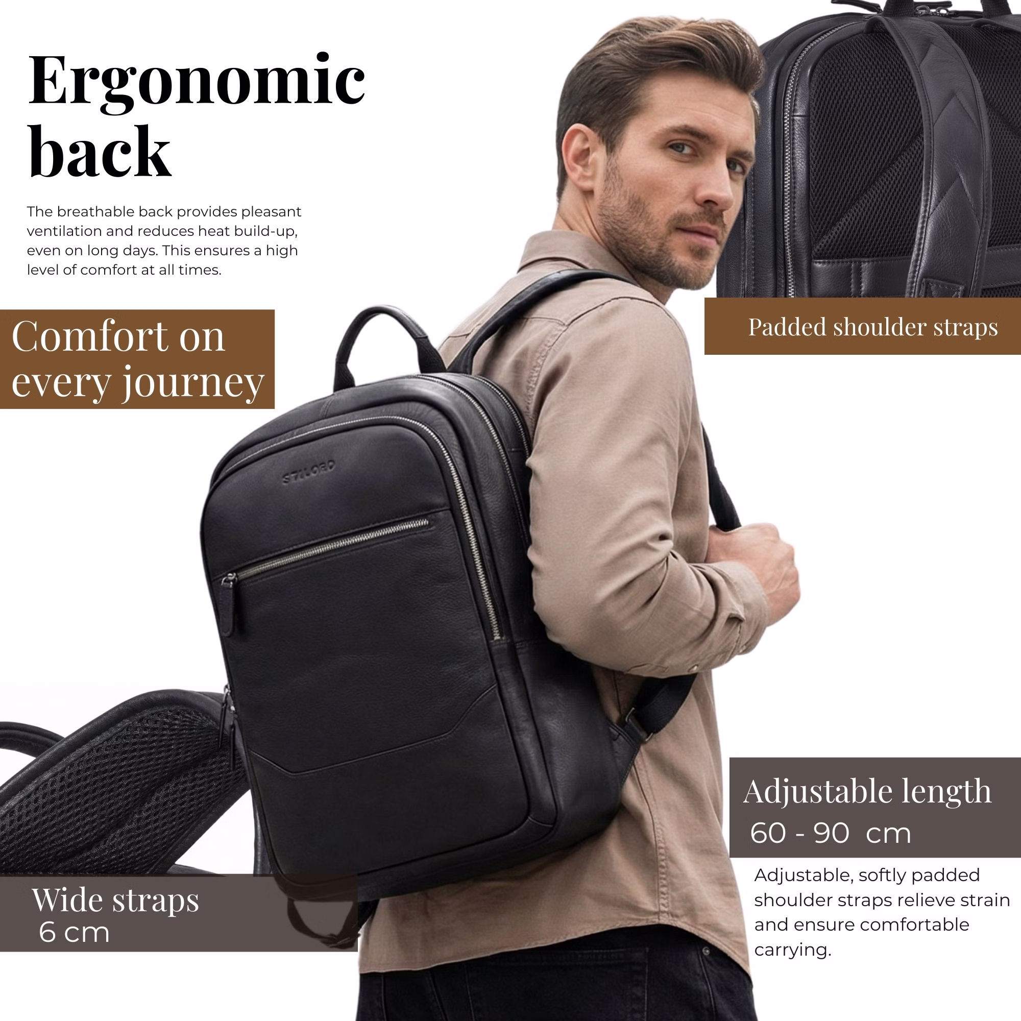 - Máxima comodidad ergonómica: espalda acolchada y correas ajustables (aprox. 60 – 90 cm | 6 cm de ancho) para un ajuste perfecto y cómodo durante todo el día.