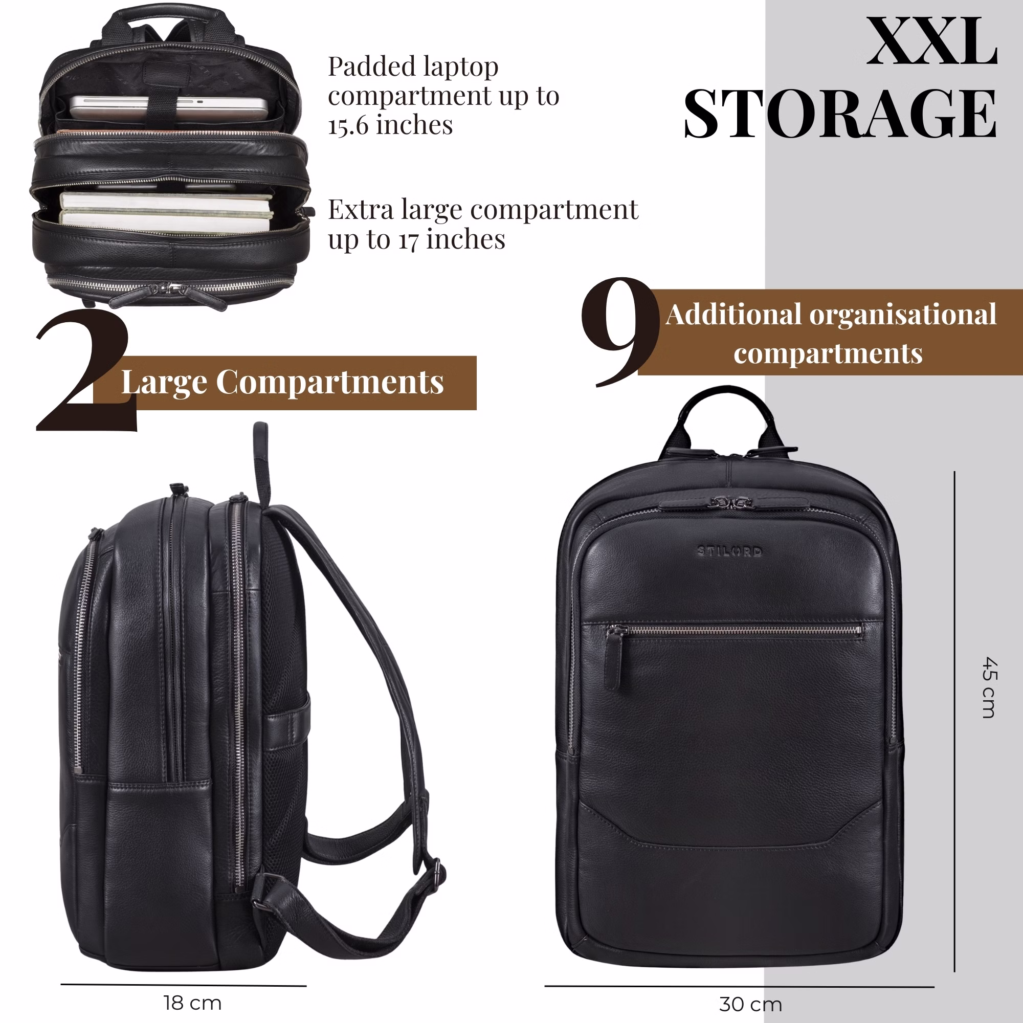 - TODO DE UN VISTAZO: Medidas: aprox. 30 x 18 x 45 cm | Peso: 1100 g | Material: piel de vacuno auténtica | Marca: STILORD | Compatibilidad: fundas para portátil de 15,6" (25 x 36 cm) | Compartimento principal sin acolchado apto para portátiles de 17" (27 x 40 cm).