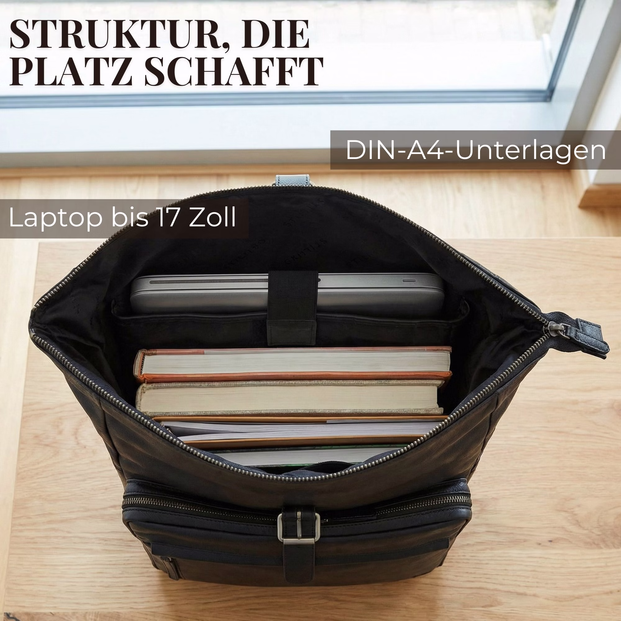 Algunos compañeros son más que equipaje: la mochila cuero hombre "Melvin" te acompaña a diario, con espacio para MacBook 17", documentos DIN A4 y botella de 1,5L.