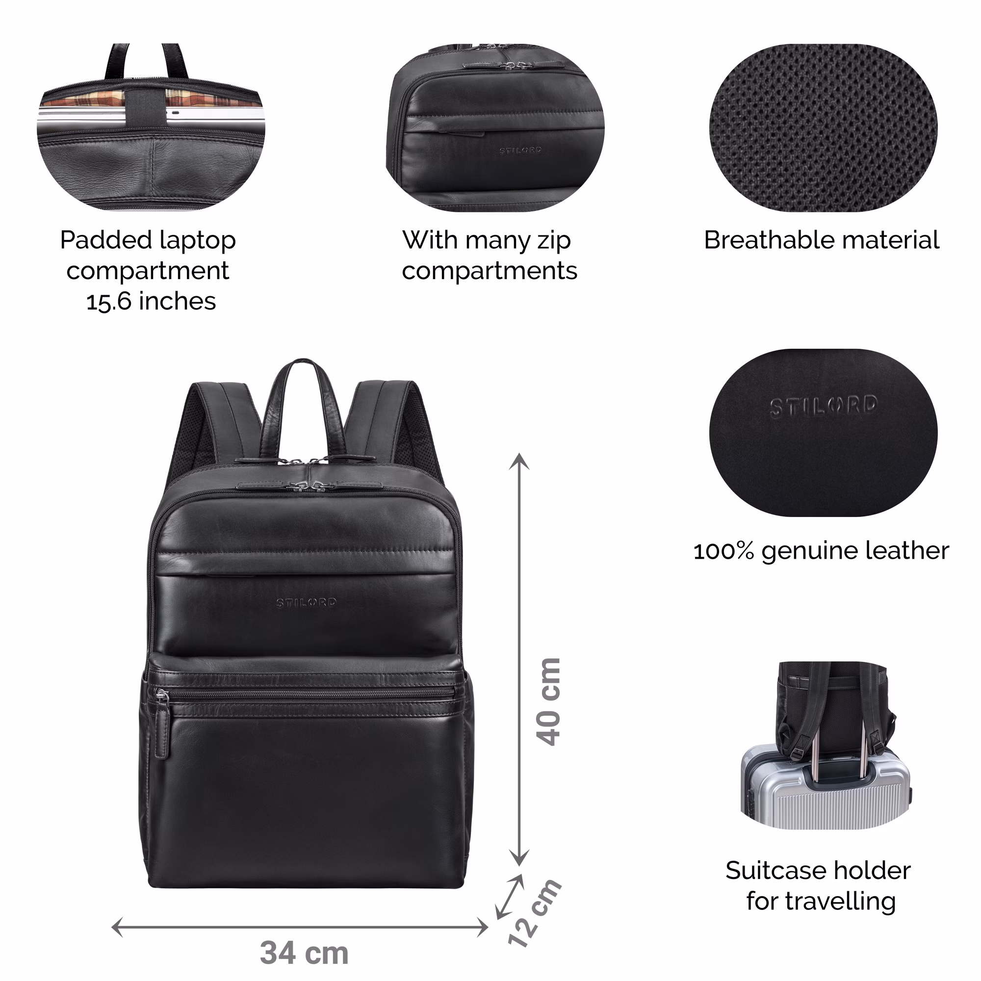 - DETALLES: Medidas (LxAnxAl): aprox. 34 x 12 x 40 cm | Peso: 1038 g | Modelo: "Gunnar" | Material: cuero natural de vaca | Marca: STILORD | Compatibilidad: Macbook 16 pulgadas, portátil 15.6 pulgadas (24 x 36 cm)