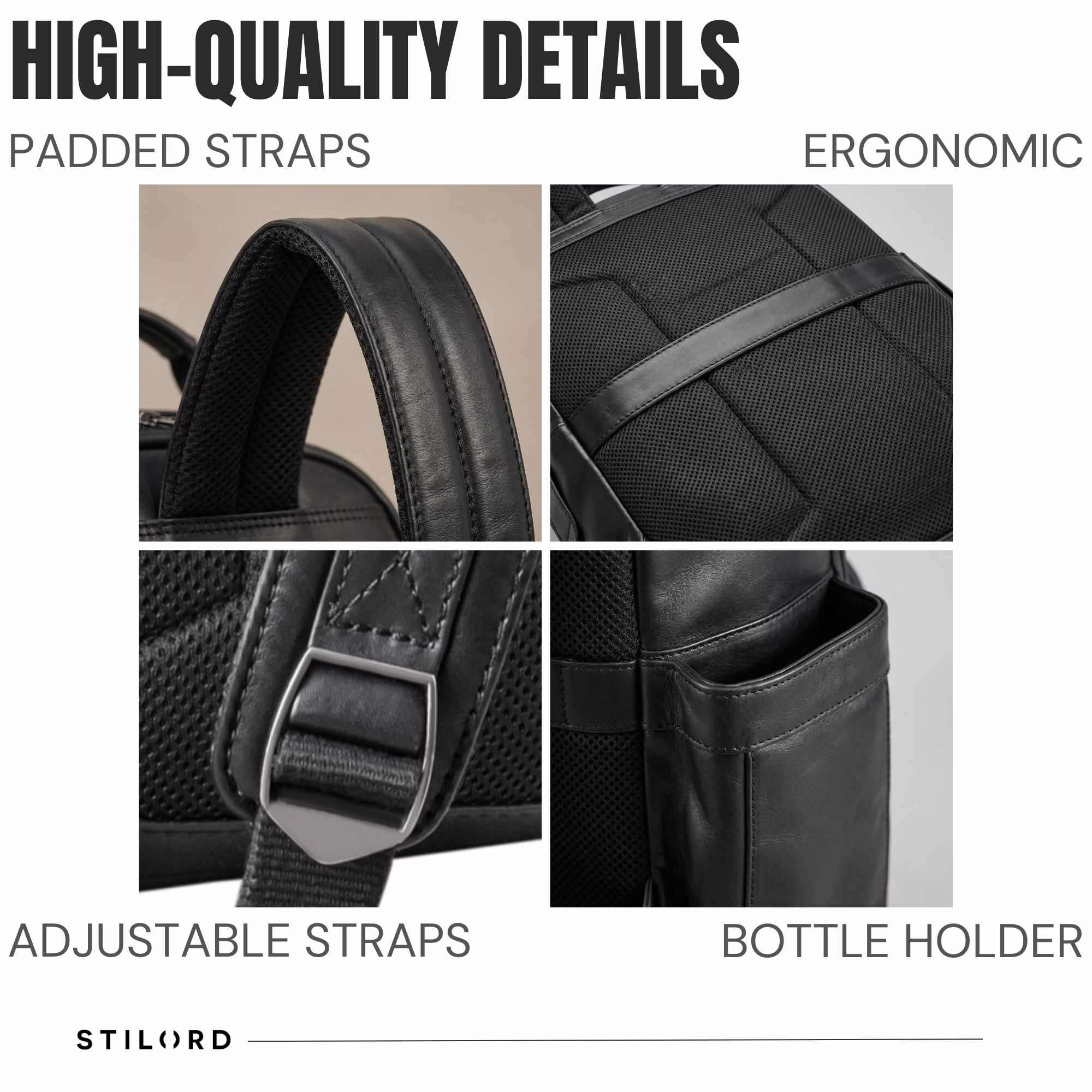- DETALLES: Medidas: aprox. 33 x 41 x 15 cm | Peso: 1250 g | Modelo: “Paco” | Material: piel auténtica de vacuno | Marca: STILORD | Características: compartimento acolchado, múltiples bolsillos con cremallera, bolsillos laterales para botellas 1L, banda para maleta