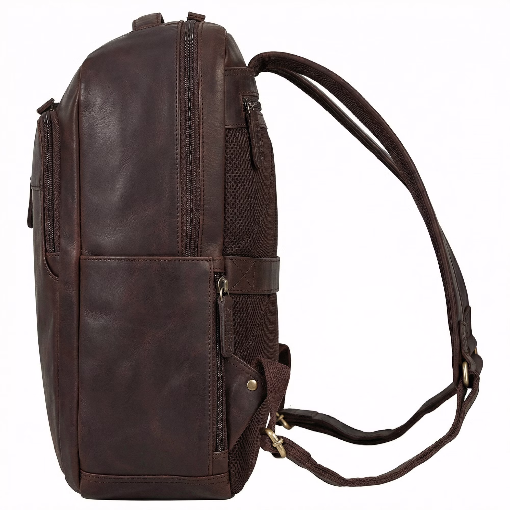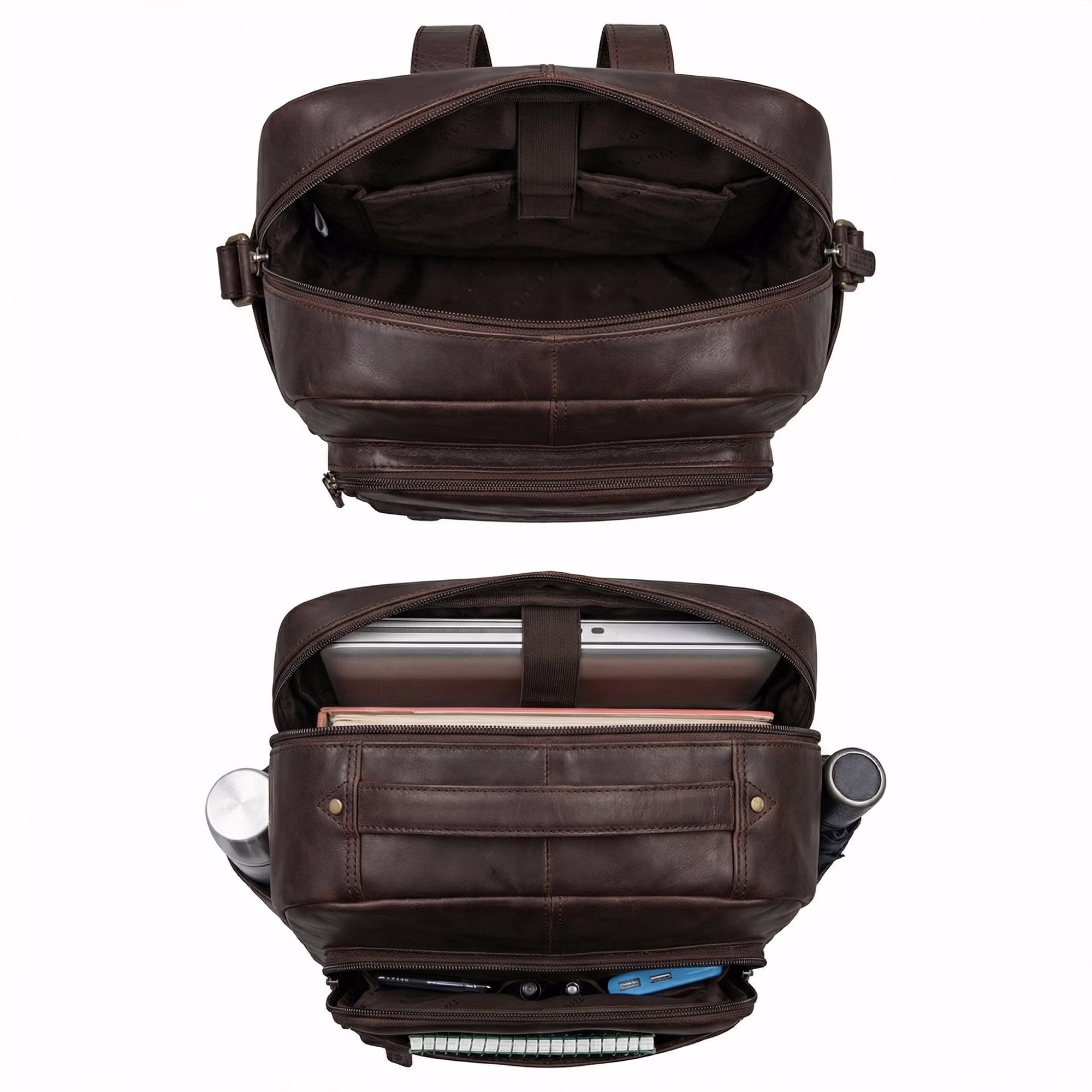 Nuestra mochila de negocios es una auténtica obra maestra en cuanto a funcionalidad y estilo. Esta espaciosa mochila de piel auténtica cuenta con numerosos compartimentos, incluido un compartimento especial para el portátil que lo mantendrá seguro y protegido. Gracias a los numerosos compartimentos y a los bolsillos laterales externos, siempre tendrá a mano todos sus objetos esenciales, como las llaves, la cartera y la botella de agua.