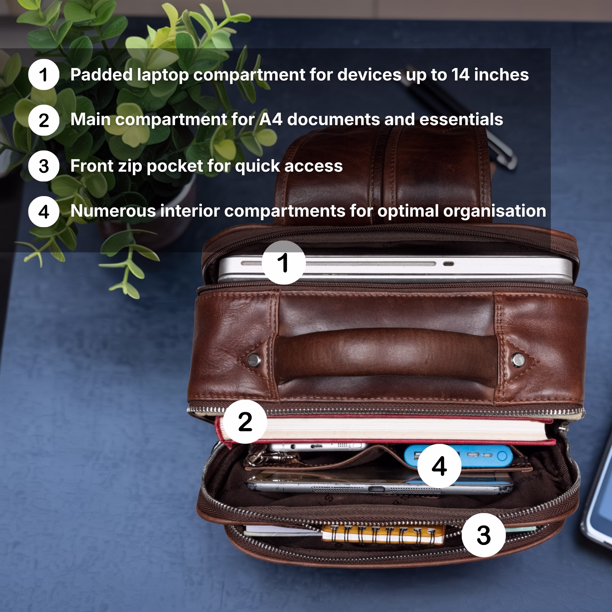 - MOCHILA DE CUERO ELEGANTE PARA MUJER: La mochila pc portatil natural combina estilo, comodidad y funcionalidad. Como mochila negocios de cuero, ofrece espacio para un portátil de hasta 14 pulgadas, documentos DIN A4 y objetos esenciales – perfecta para la oficina, la universidad y los viajes.