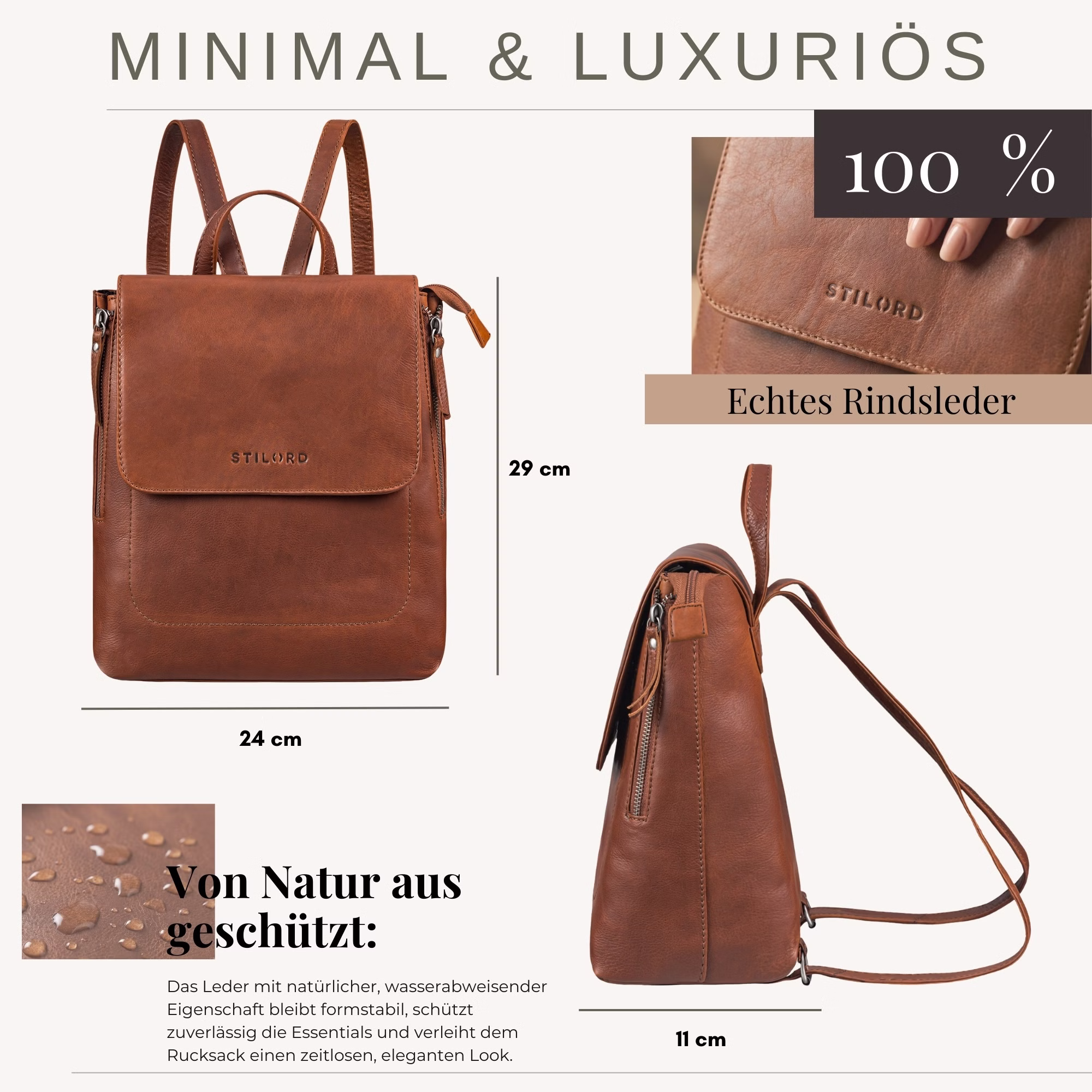 - Dimensiones (L x An x Al): aprox. 24 x 11 x 29 cm | Material: cuero vacuno auténtico | Peso: 735 gramos