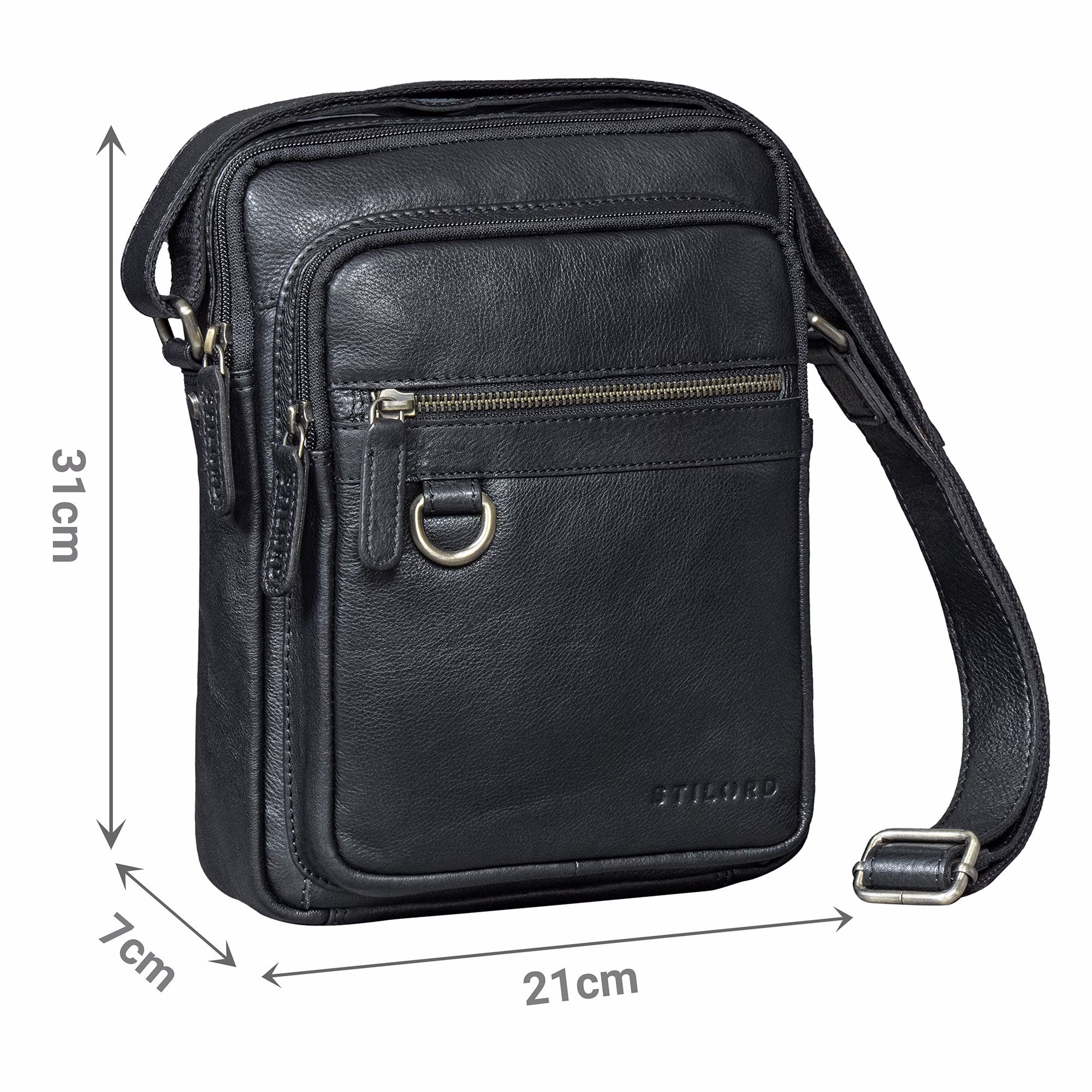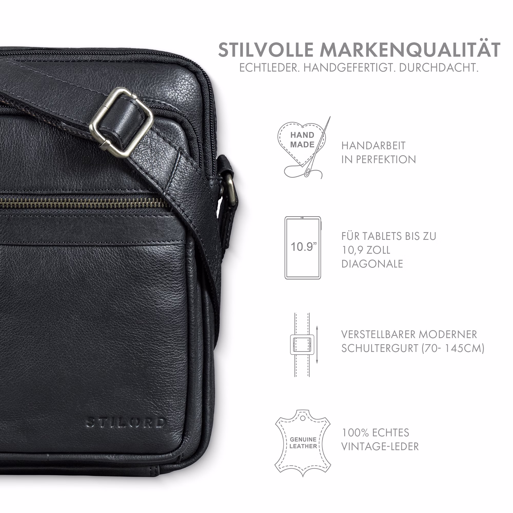 - Dimensiones (L x H x P): 21 x 31 x 7 cm | Peso: 530 g | Material: cuero auténtico de vaca | Fabricante: STILORD | Compatibilidad: iPads hasta 10,9 pulgadas (18 x 25 cm), documentos DIN A5 y botella de 0,5 l