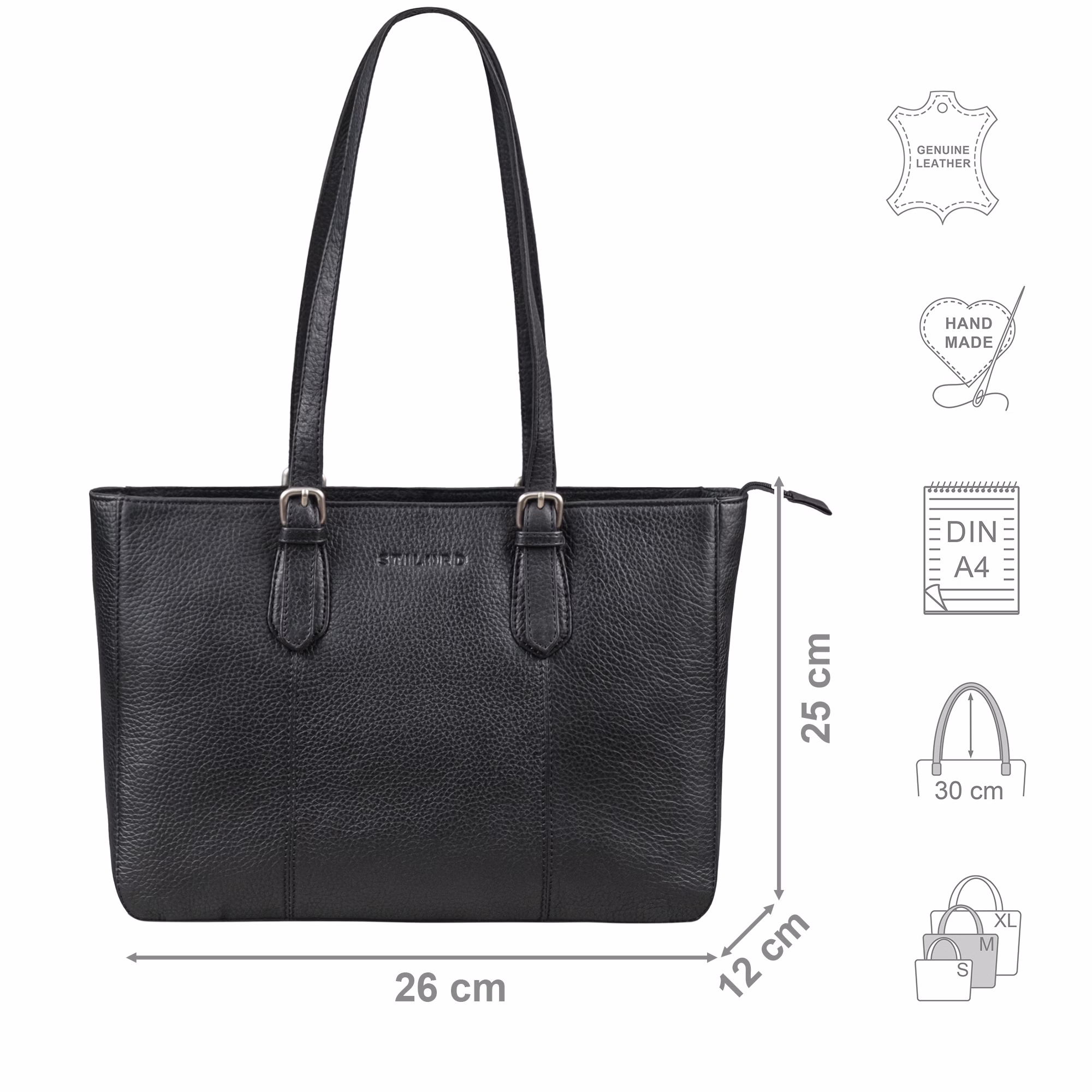 • DETALLES: Dimensiones (LxAxA): aprox. 26 x 12 x 25 cm | Peso: 750 g | Modelo: "Rosalind" | Material: Piel auténtica natural | Fabricante: STILORD | Compatibilidad: Documentos hasta DIN A4 | Características especiales: Asas de cuero ajustables, diseño elegante.